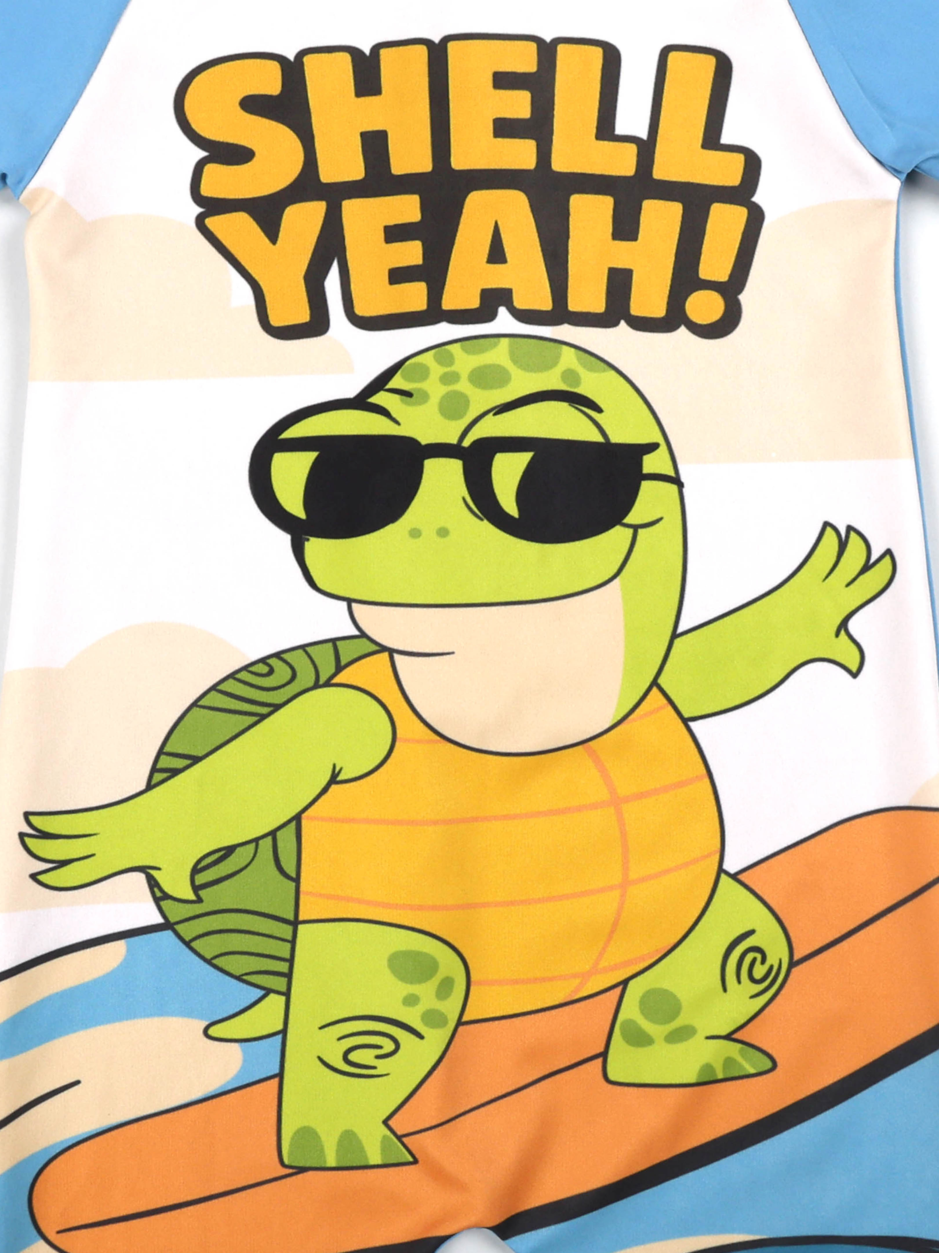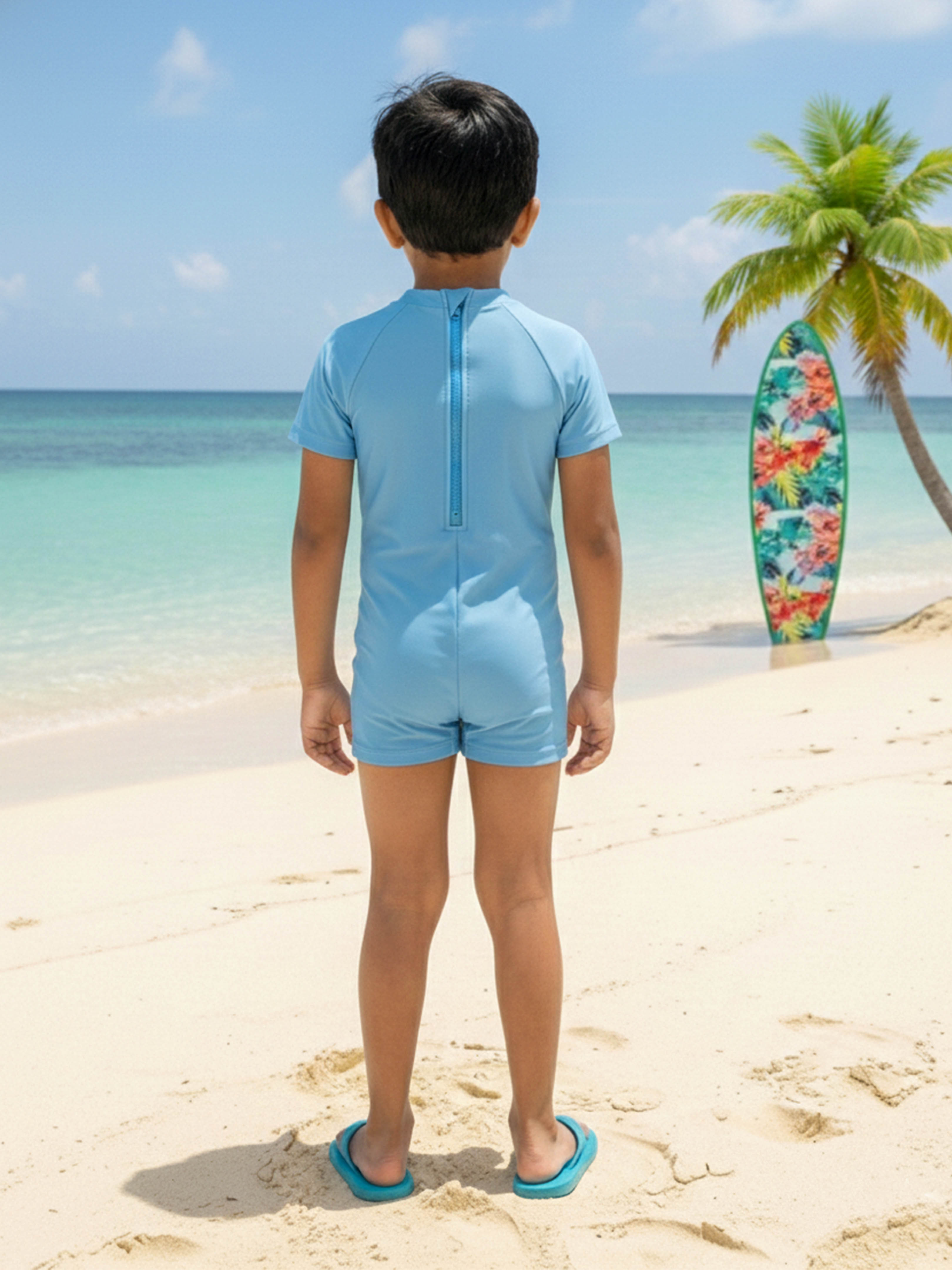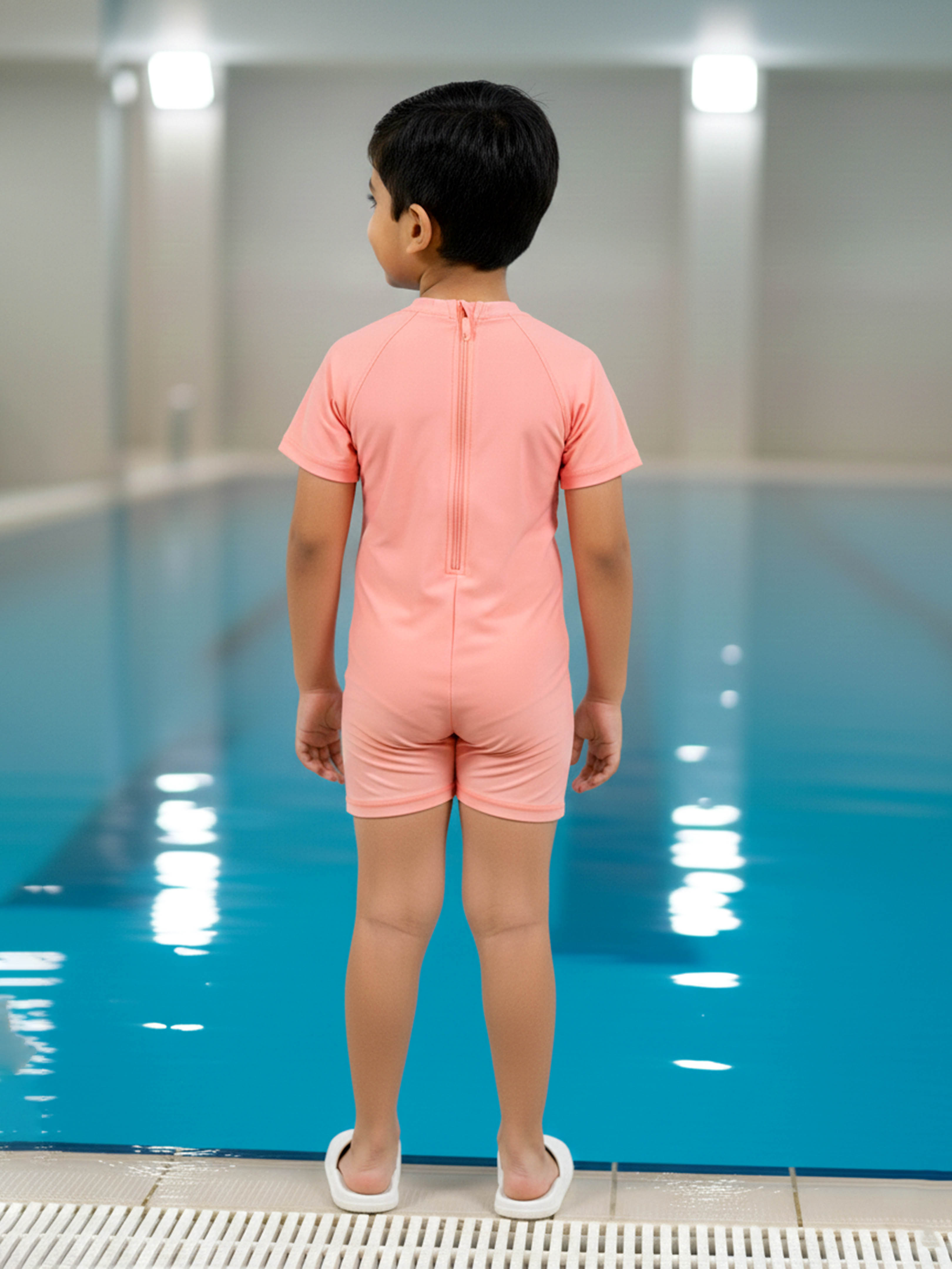 Kiddopanti brings to you the latest fashion clothes for your smart dressing young ones with this Printed One-Piece Swim Suit (Swimwear Bodysuit). Designed in a trendy solid colour base with attractive printed detailing, this mid-thigh length bodysuit offers the perfect combination of style, comfort, and protection for fun-filled water adventures. Crafted from premium stretch fabric, this swim suit ensures a snug yet flexible fit, allowing easy movement during swimming, beach play, pool time, and water sports. The half sleeves and round neckline provide added coverage, while the back zip opening ensures easy wear and removal. With built-in UV protection, it keeps your little one safe from harsh sun rays, making it a perfect choice for summer vacations, pool days, and beach outings.