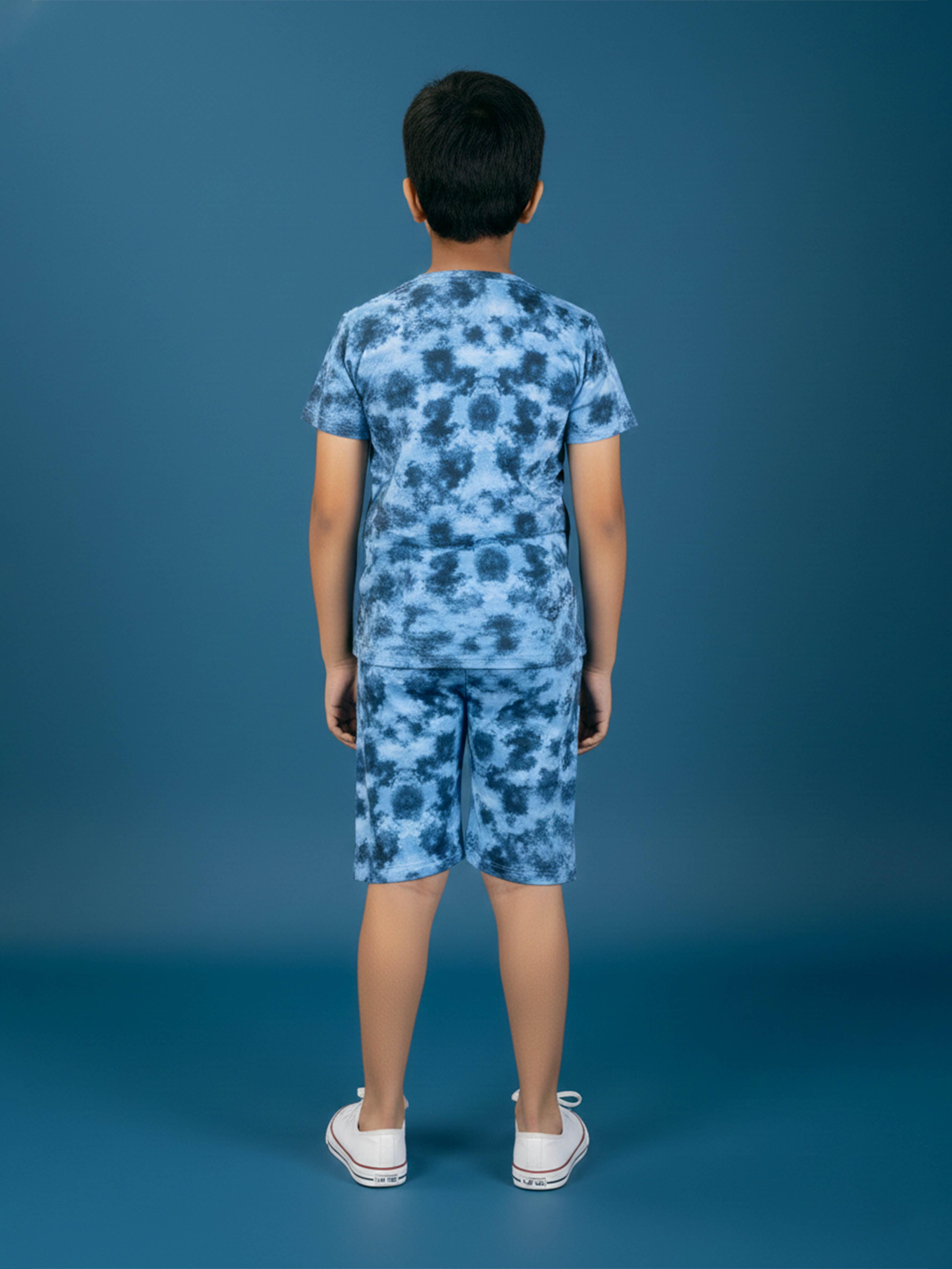 Kiddopanti brings to you the latest fashion clothes for your smart dressing young ones with this trendy Tie-Dye Printed T-Shirt & Knee Length Shorts Co-Ord Set. Designed in a stylish blue tie-dye theme, this combo features a graphic printed round neck half sleeve T-shirt paired with matching tie-dye knee-length shorts, creating a cool, coordinated, and futuristic look kids will love.