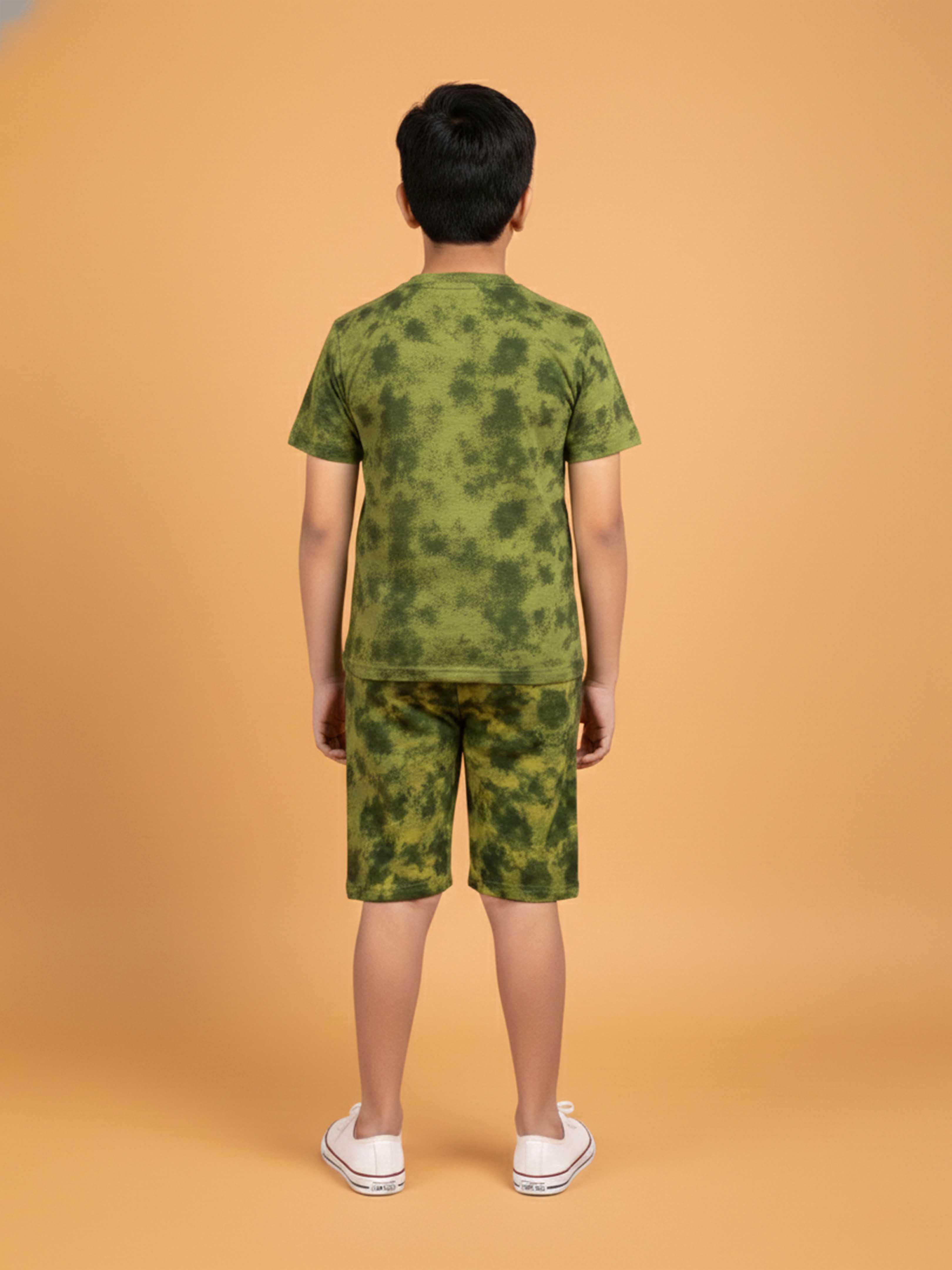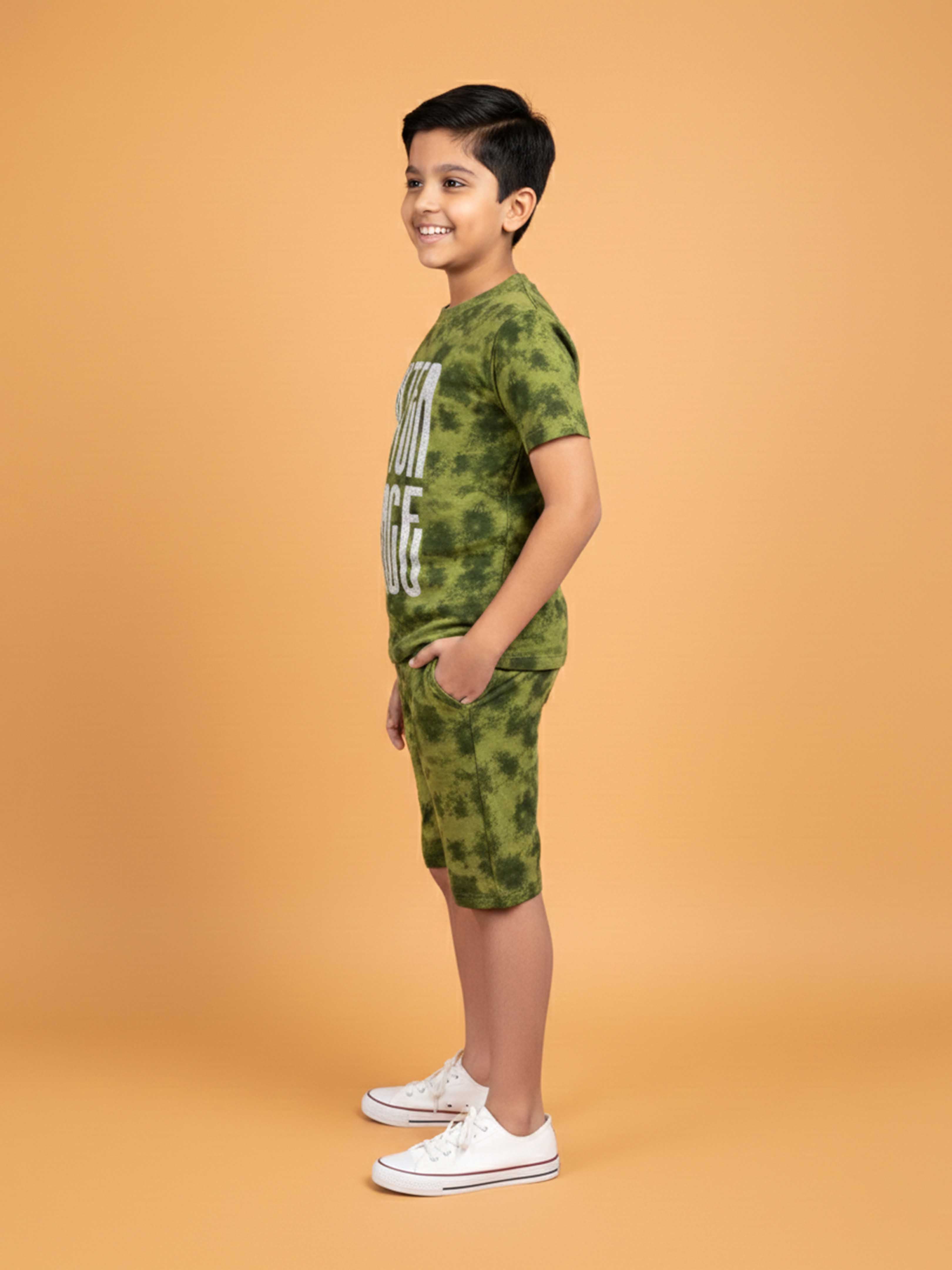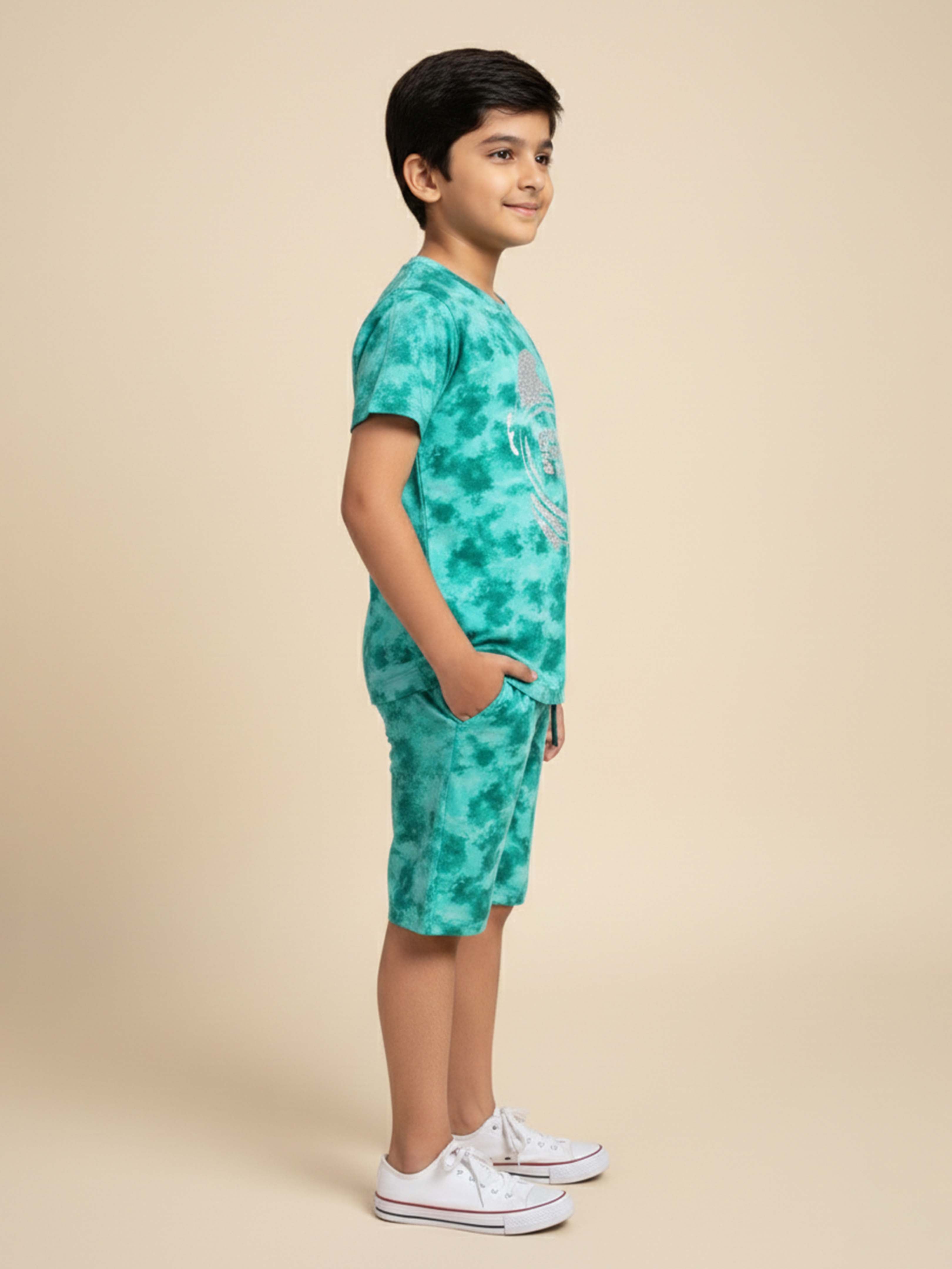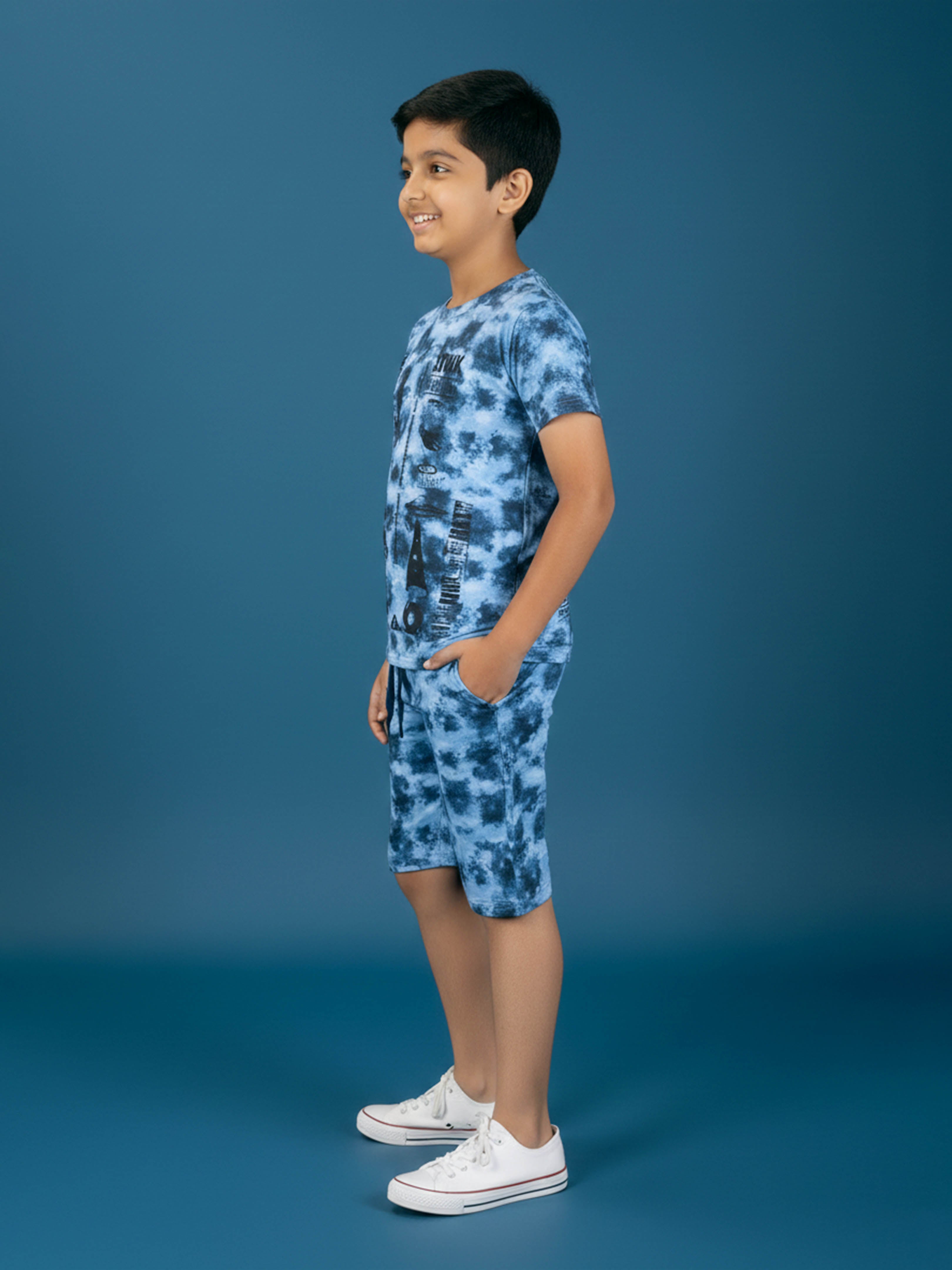 Kiddopanti Boys Cotton Tie & Dye Printed T-Shirt With Chest Print & Knee Length Shorts Set