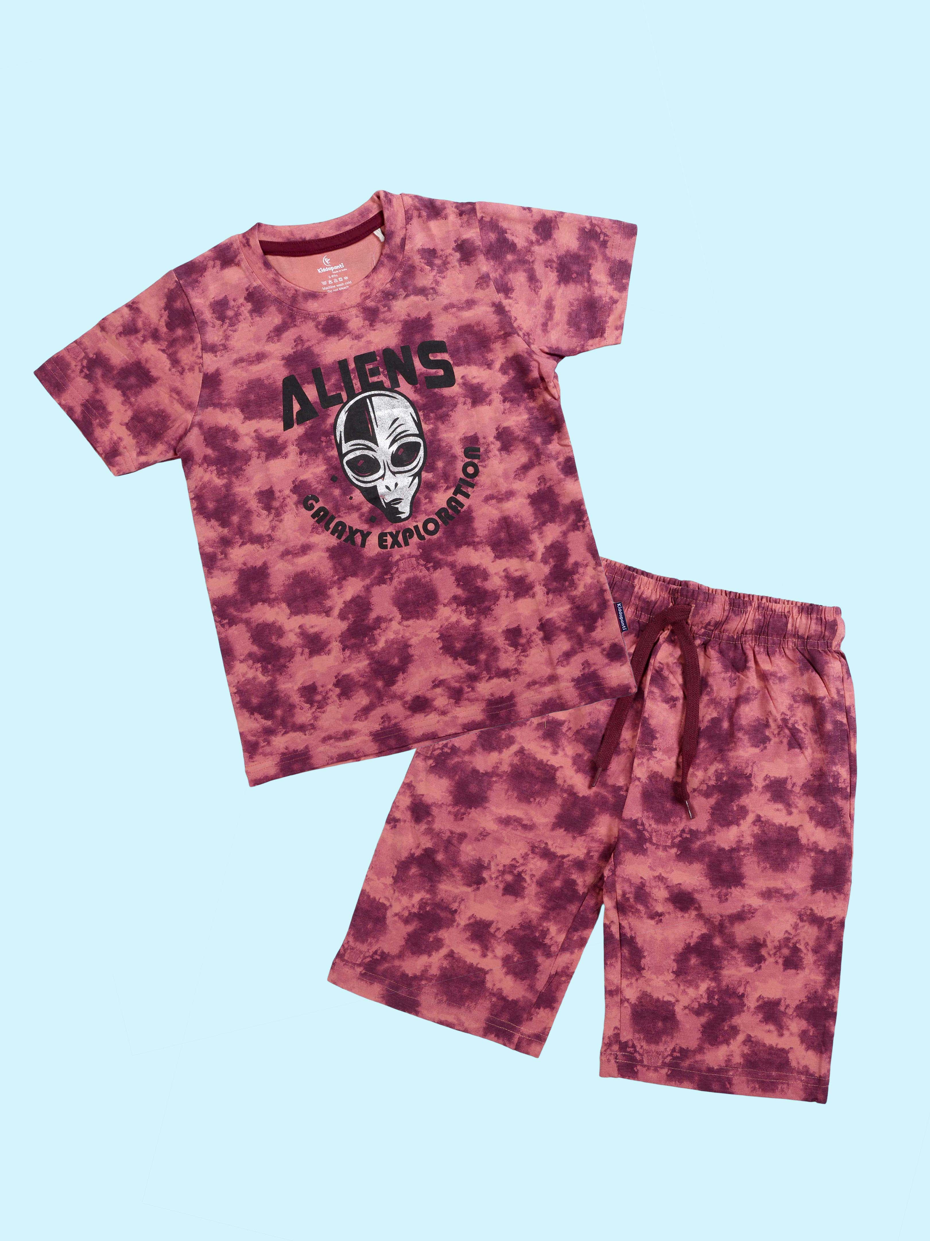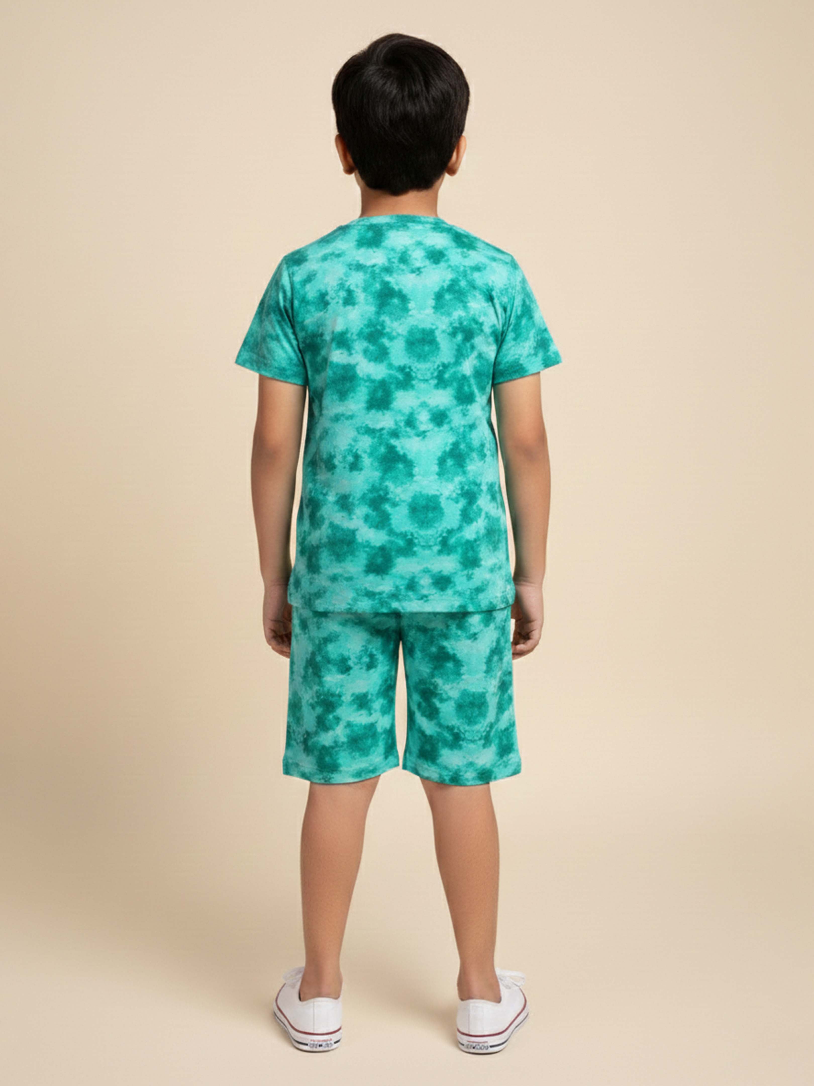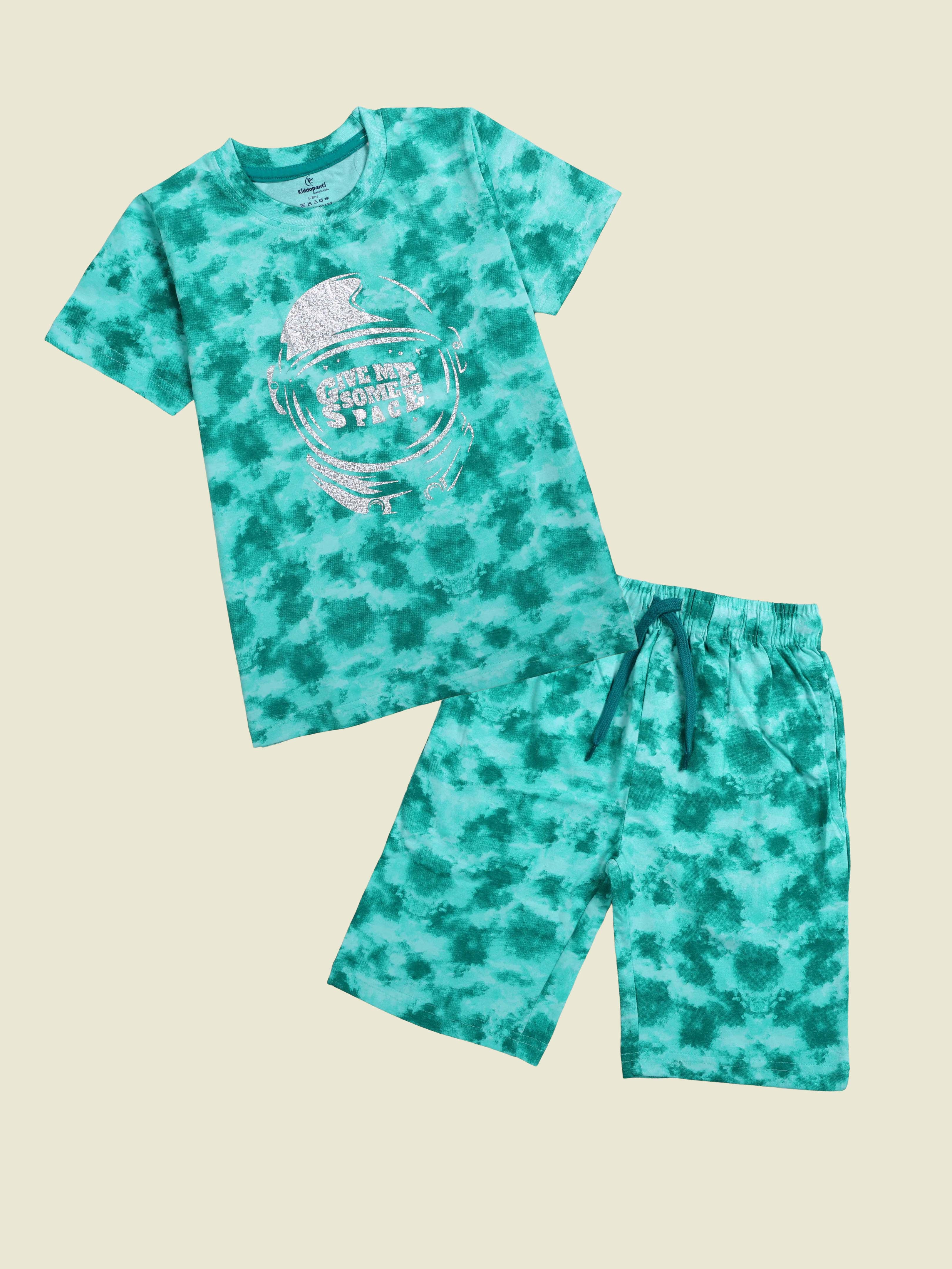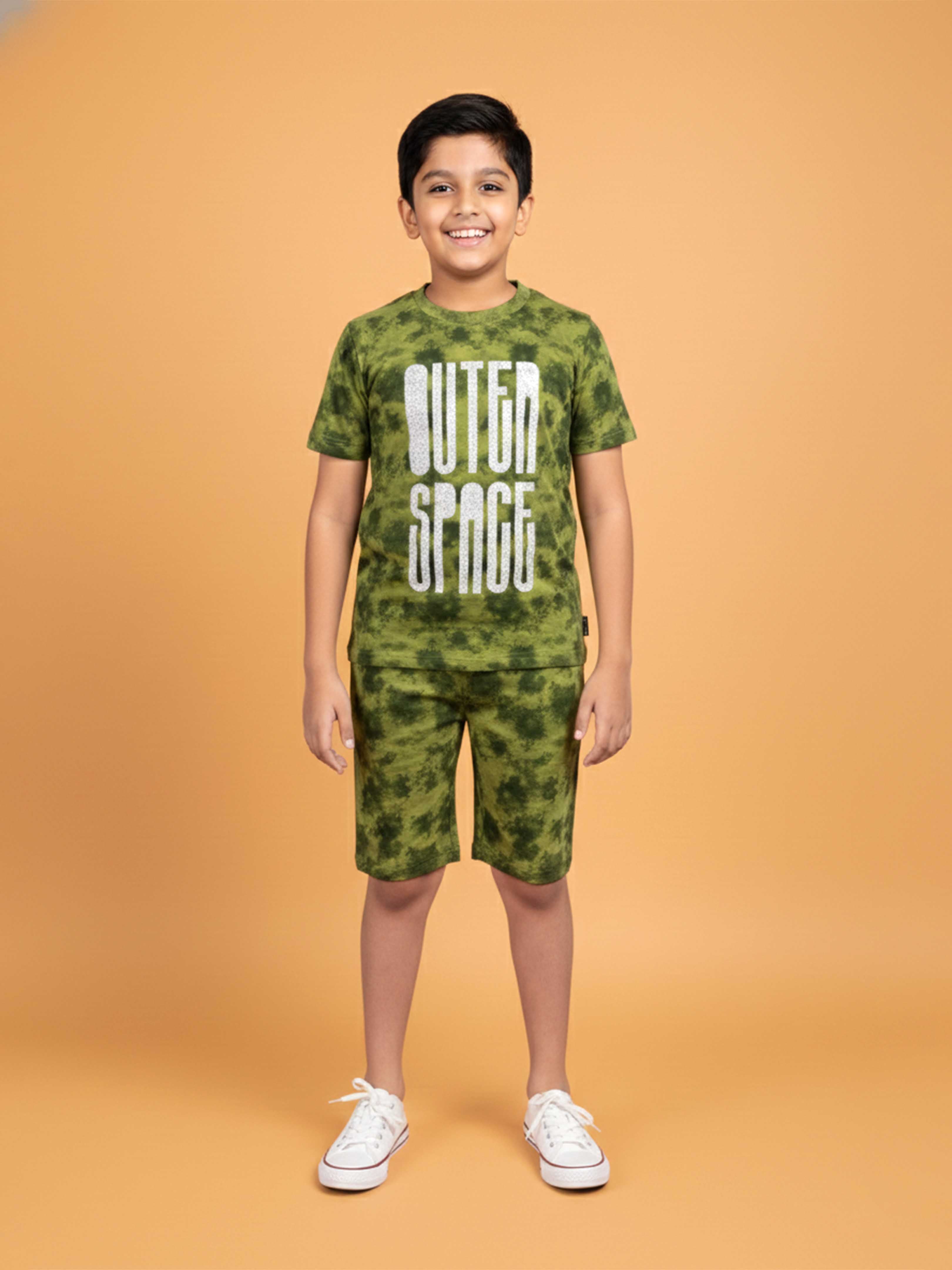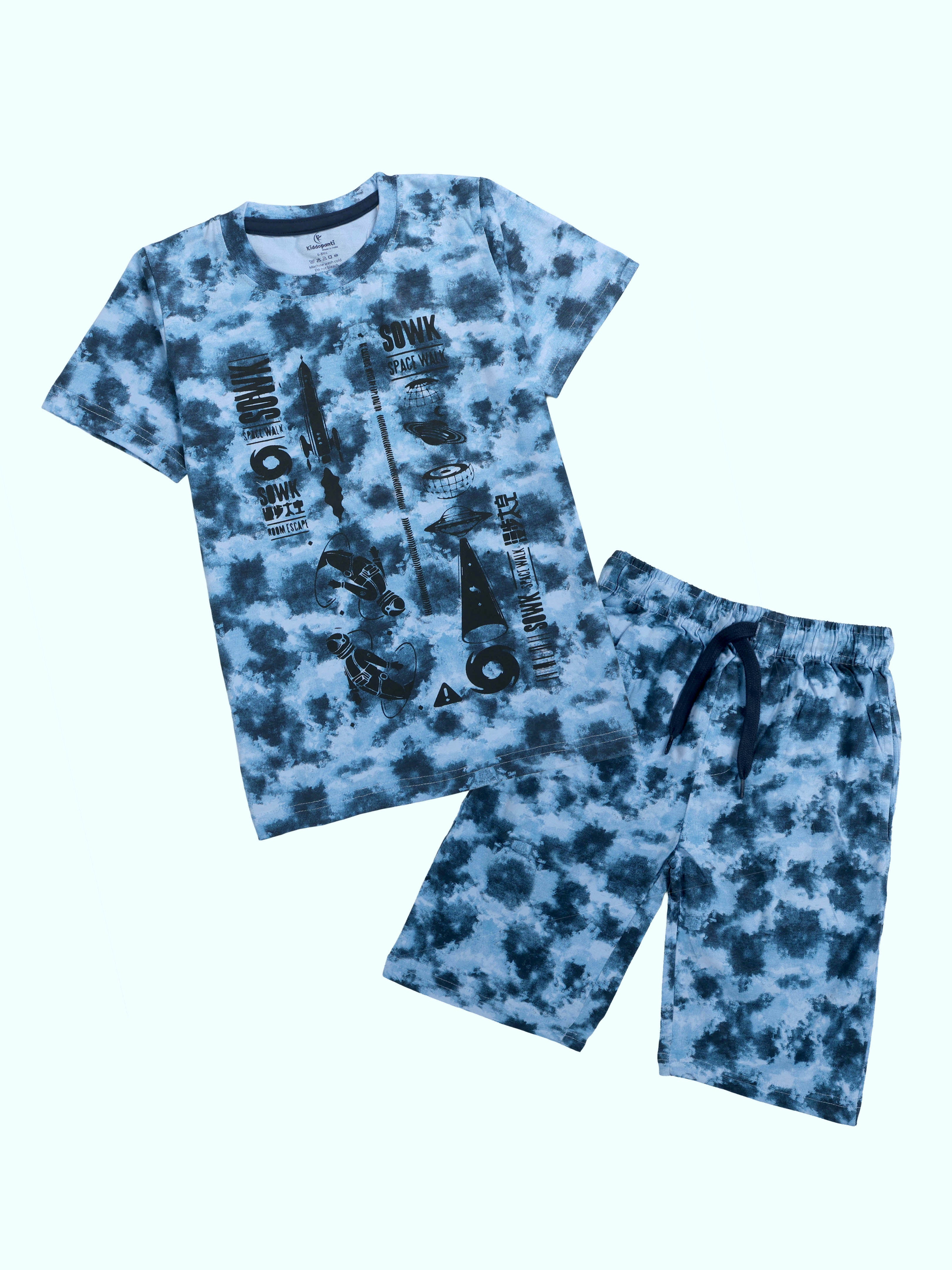 The T-shirt showcases bold space-inspired graphic elements and typography prints, giving it a modern, energetic vibe, while the shorts feature a refreshing all-over tie-dye pattern for a playful and trendy finish. Crafted from soft and breathable cotton fabric, this set ensures all-day comfort, flexibility, and skin-friendly wear — perfect for playtime, casual outings, travel, lounging, and everyday use.