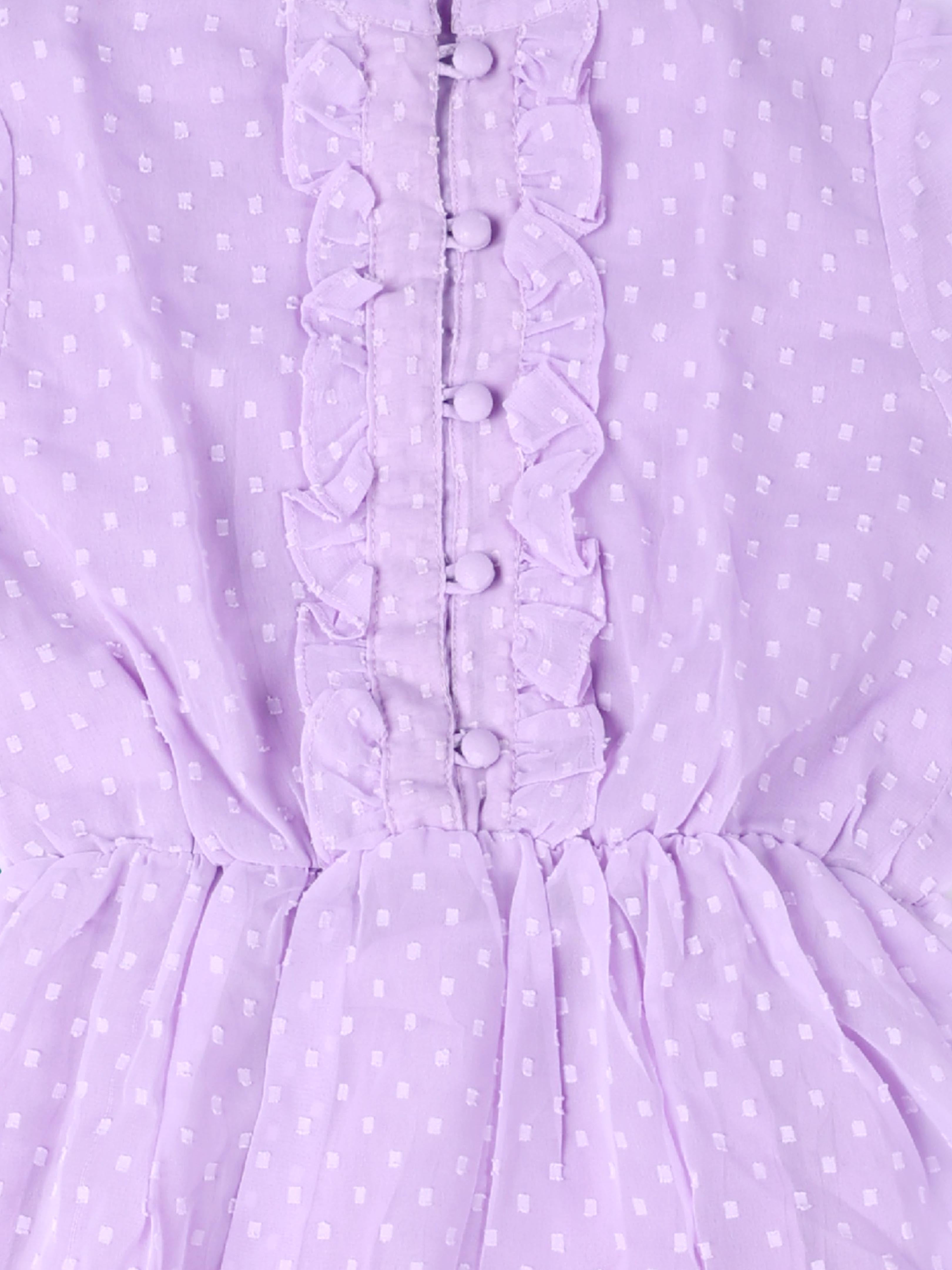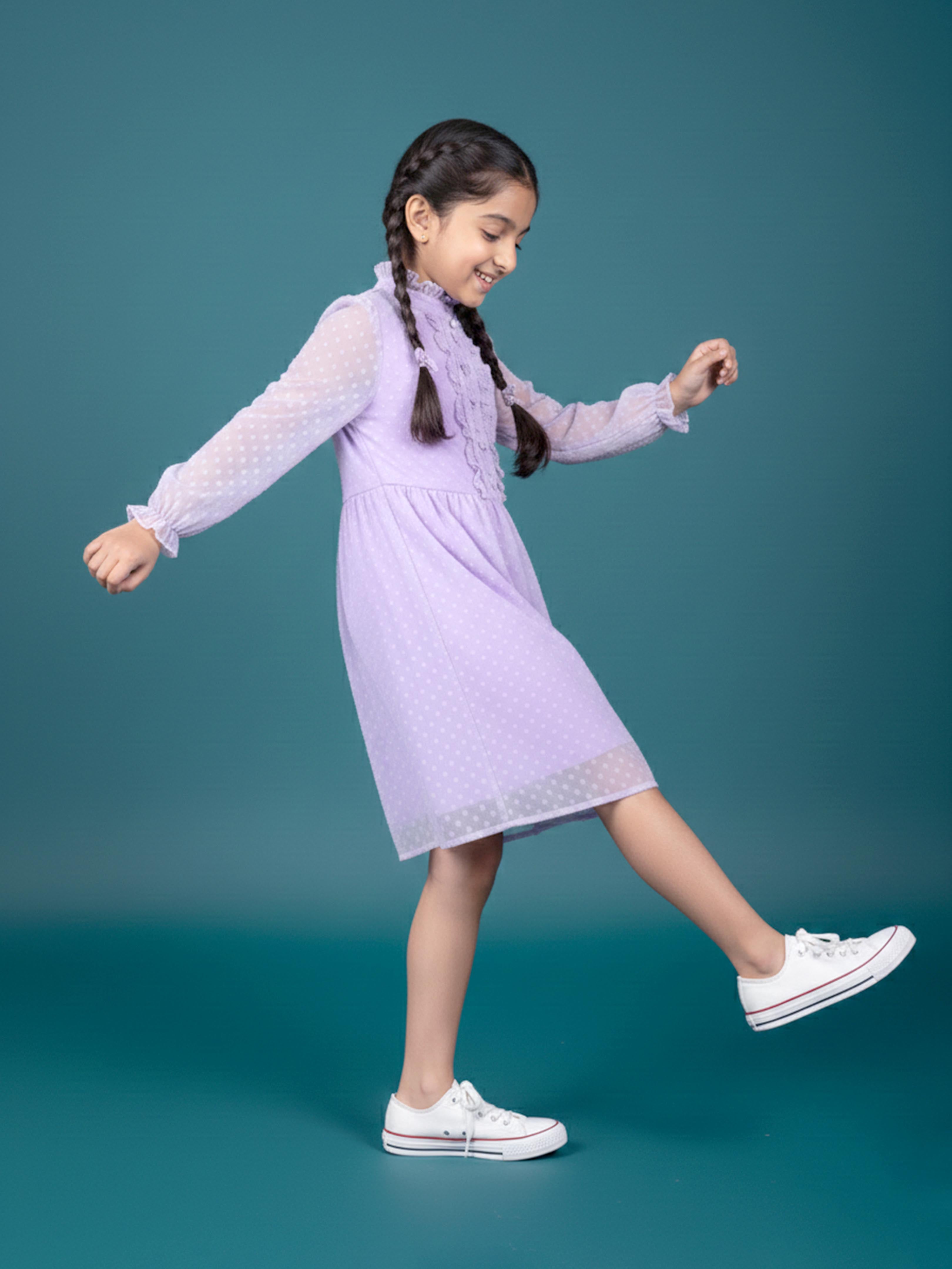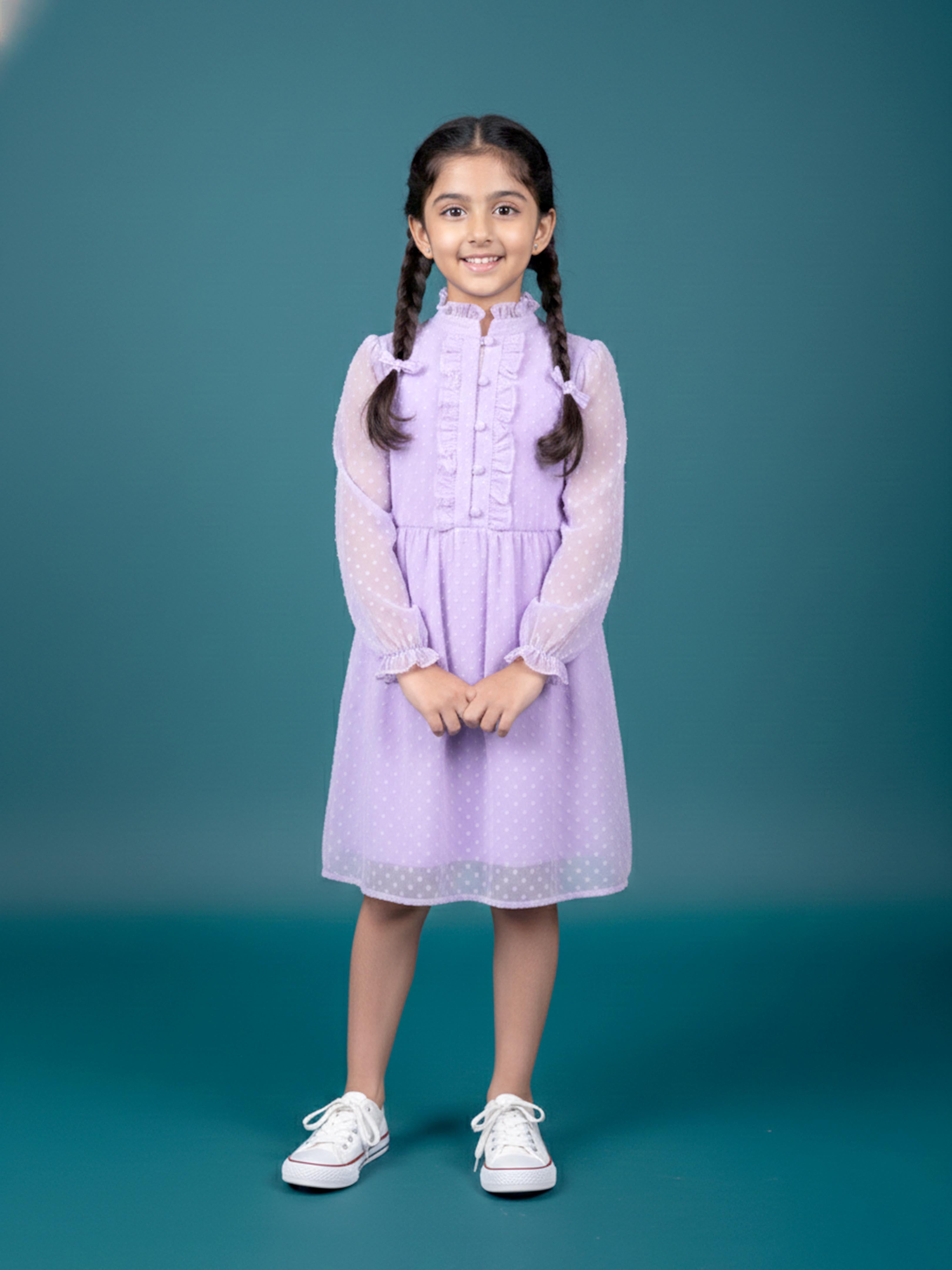 Kiddopanti brings to you the latest fashion clothes for your smart dressing young ones. These Woven Butta Fabric Front yoke frill detailed Placket Full sleeve Dress is an ideal selection for your style icon this season.