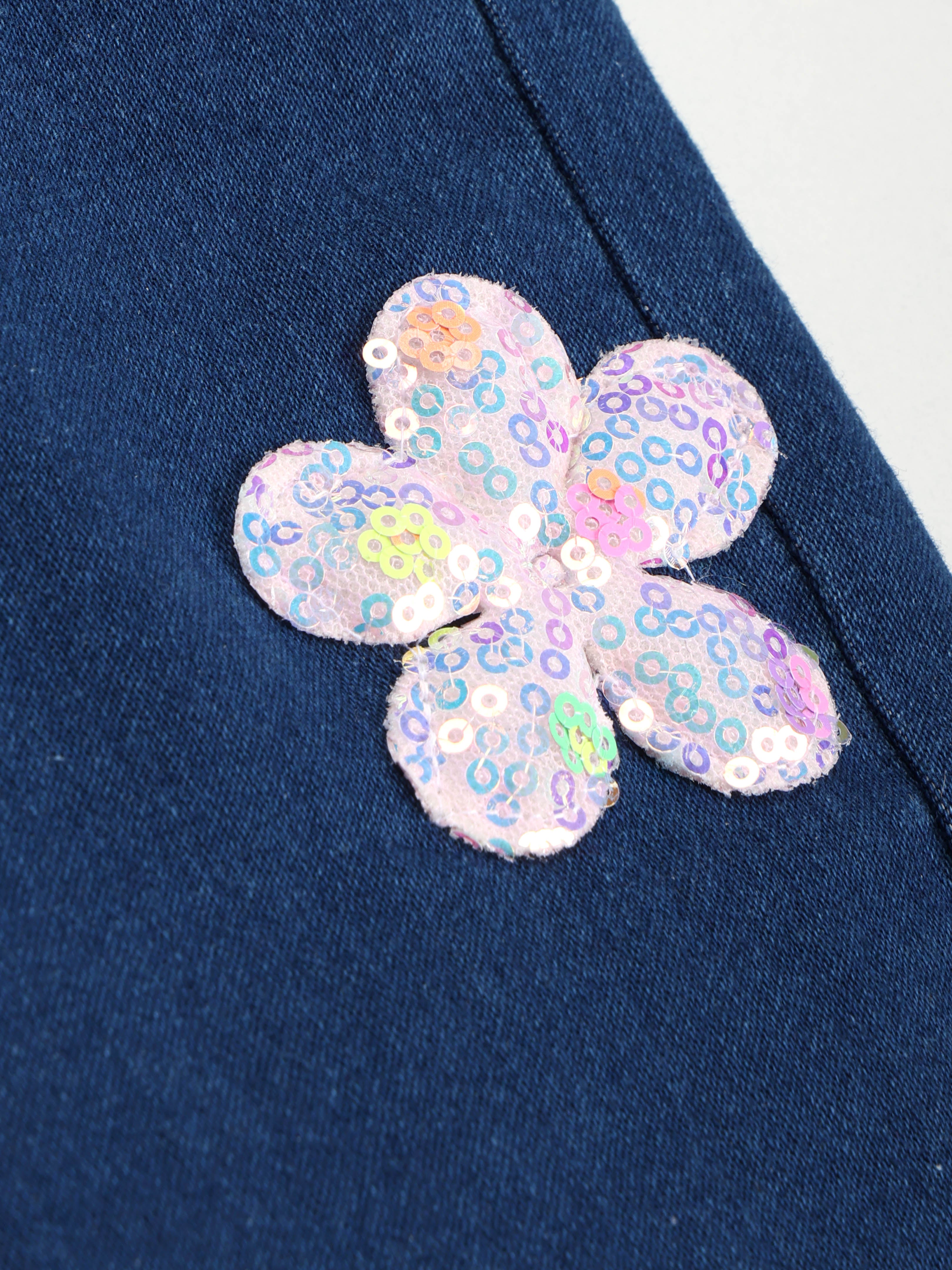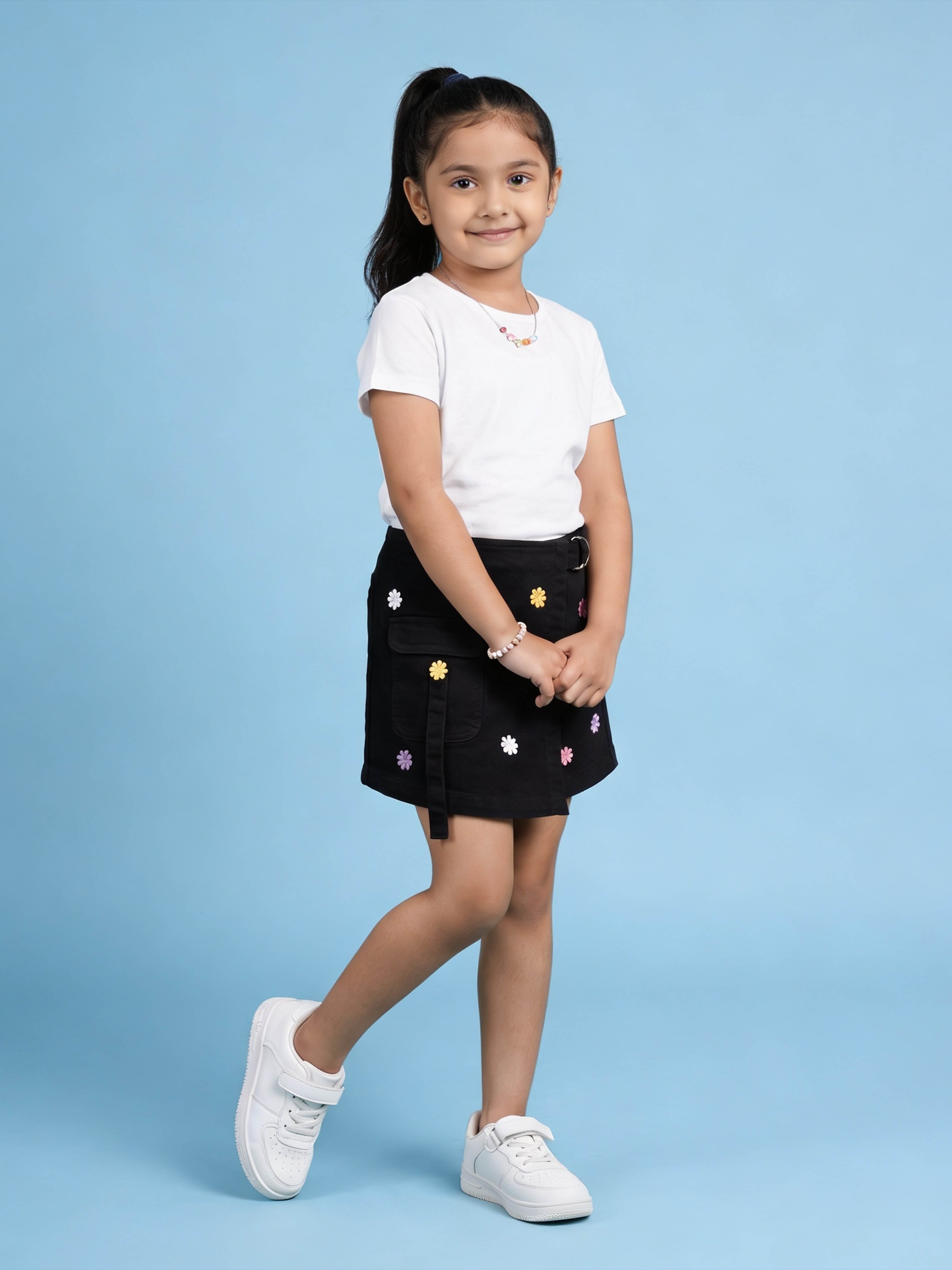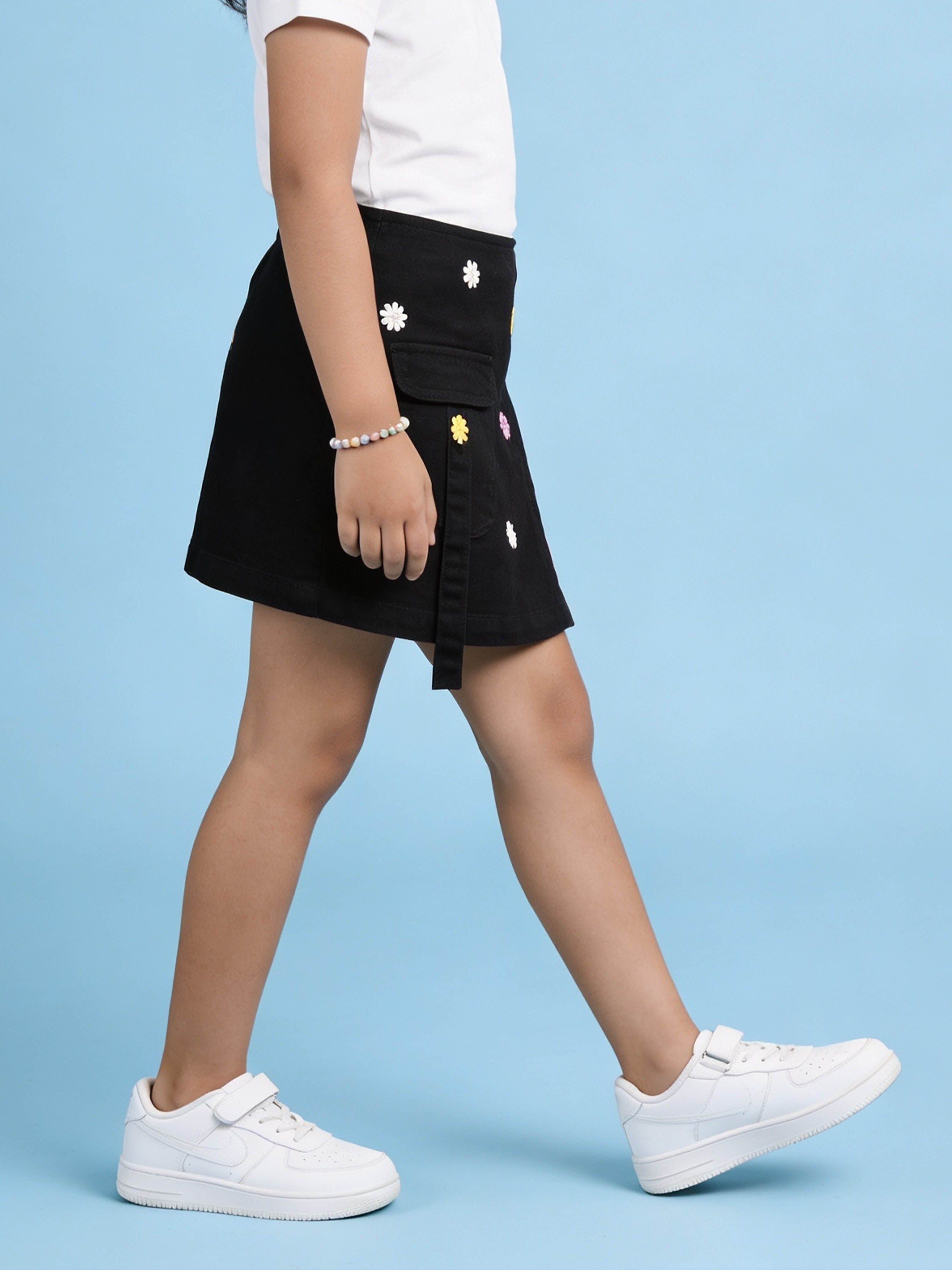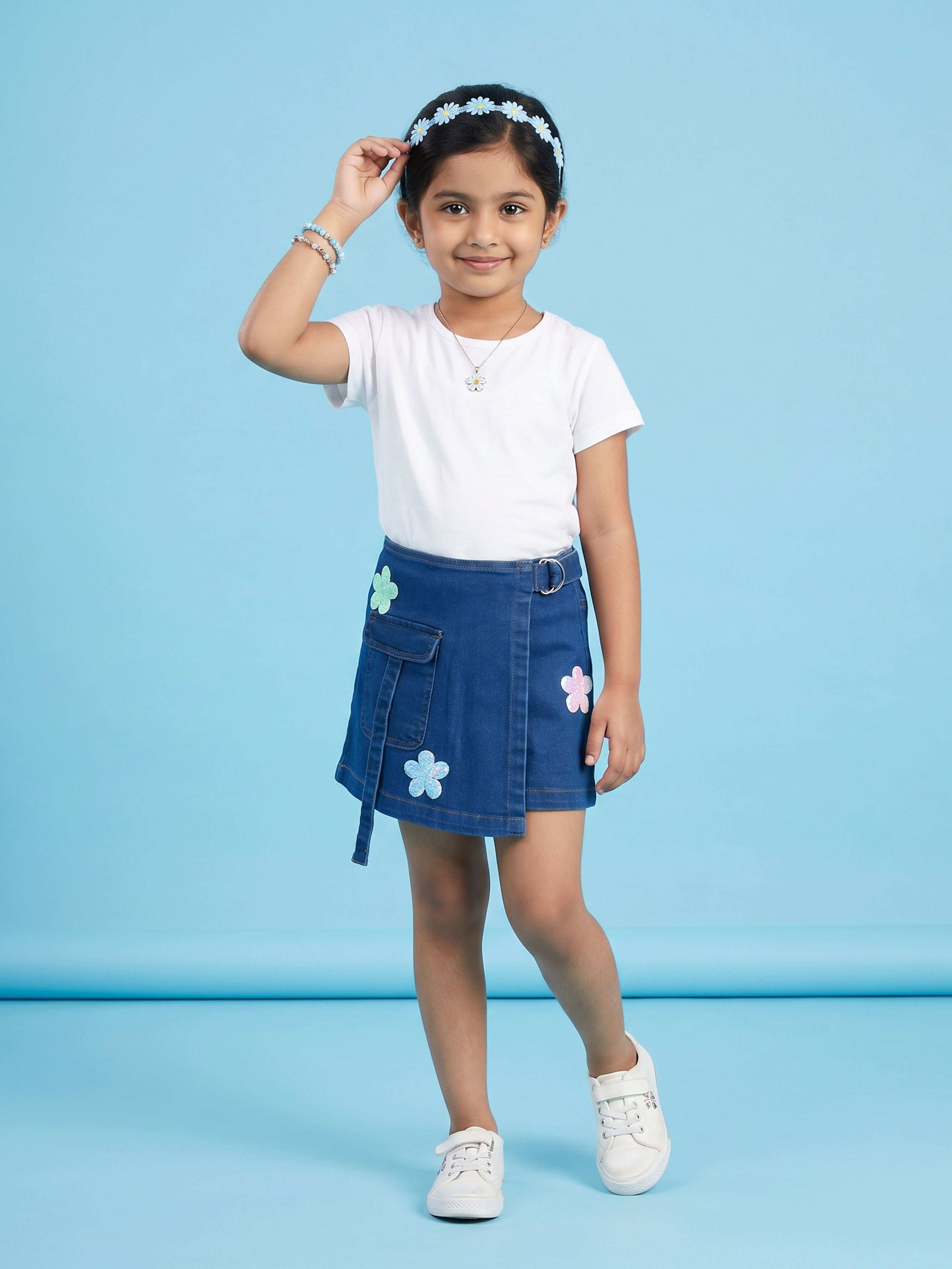 Crafted from durable and comfortable denim fabric, this piece features a structured overlap front panel enhanced with colourful 3D flower appliqué detailing. The appliqué flowers add a soft, cheerful, and eye-catching touch, making this skort perfect for fun outings and special occasions.