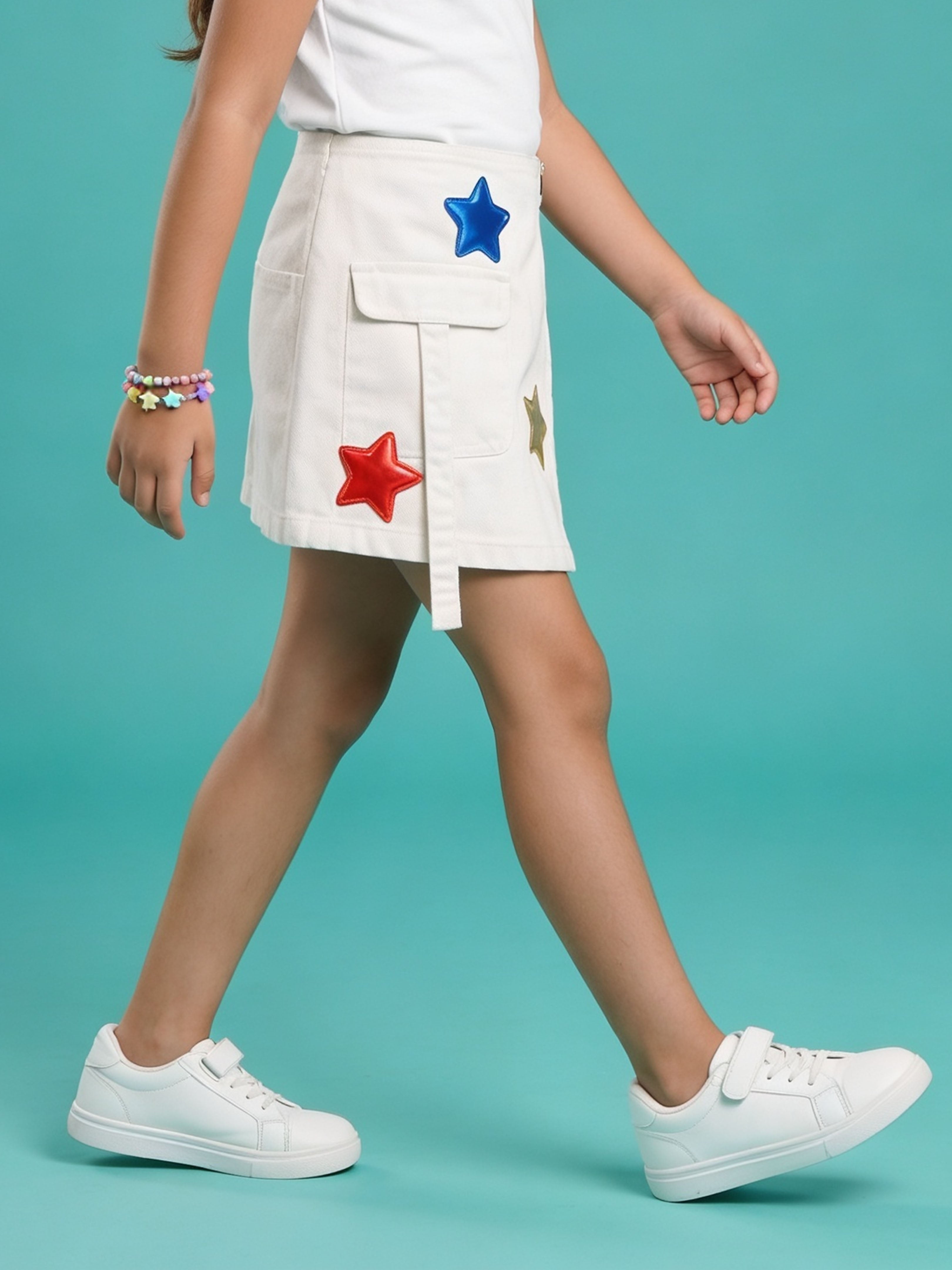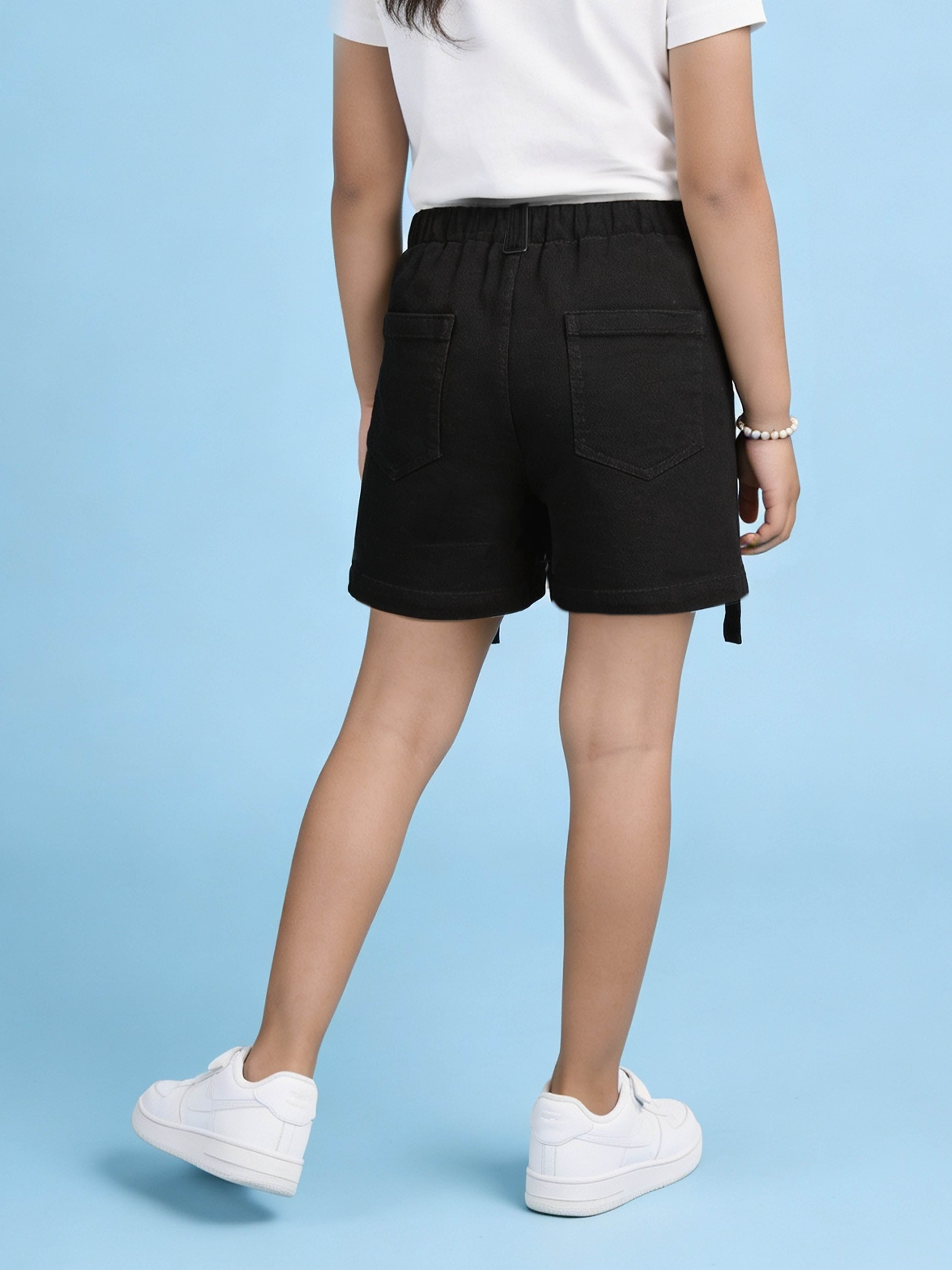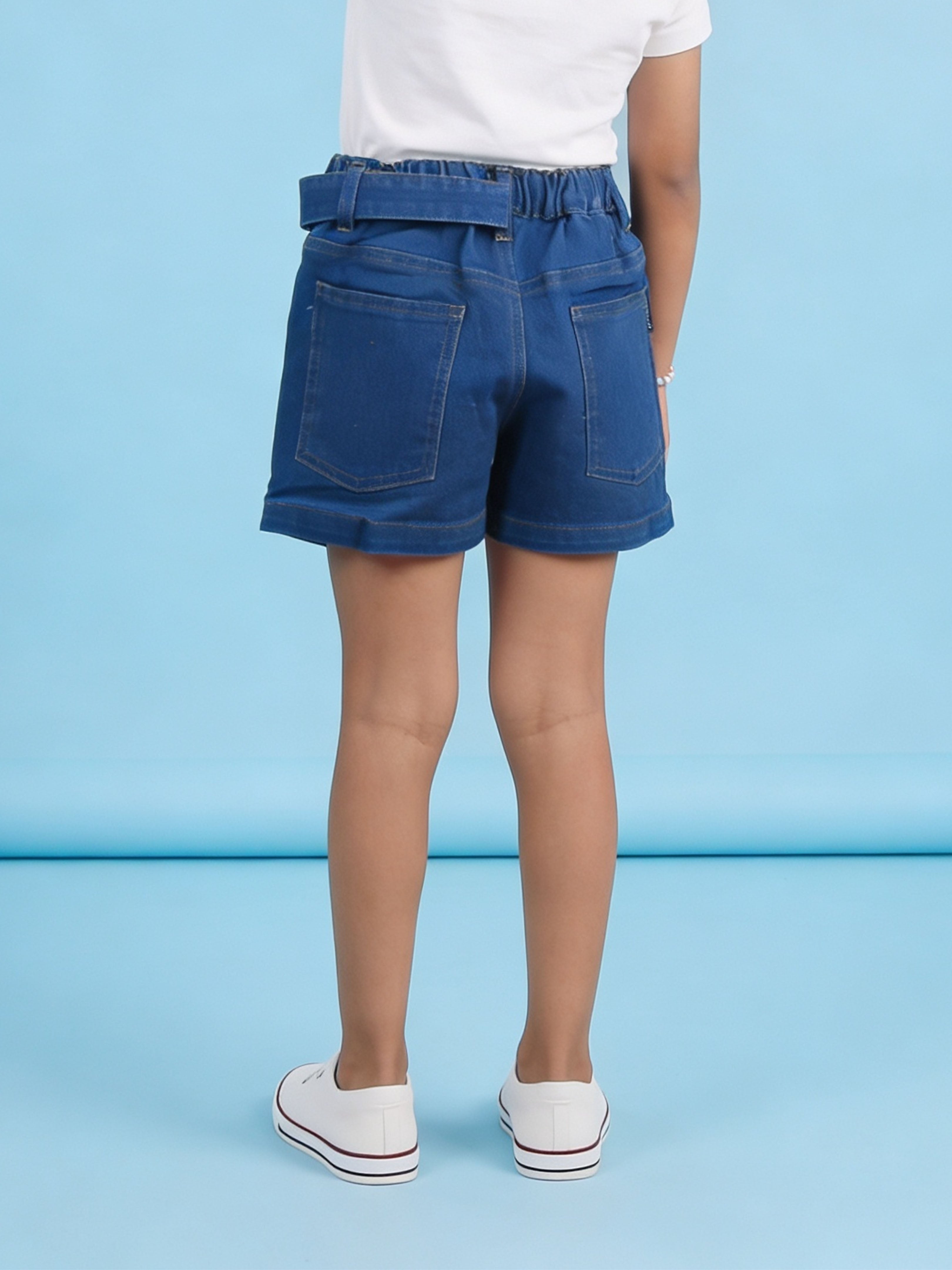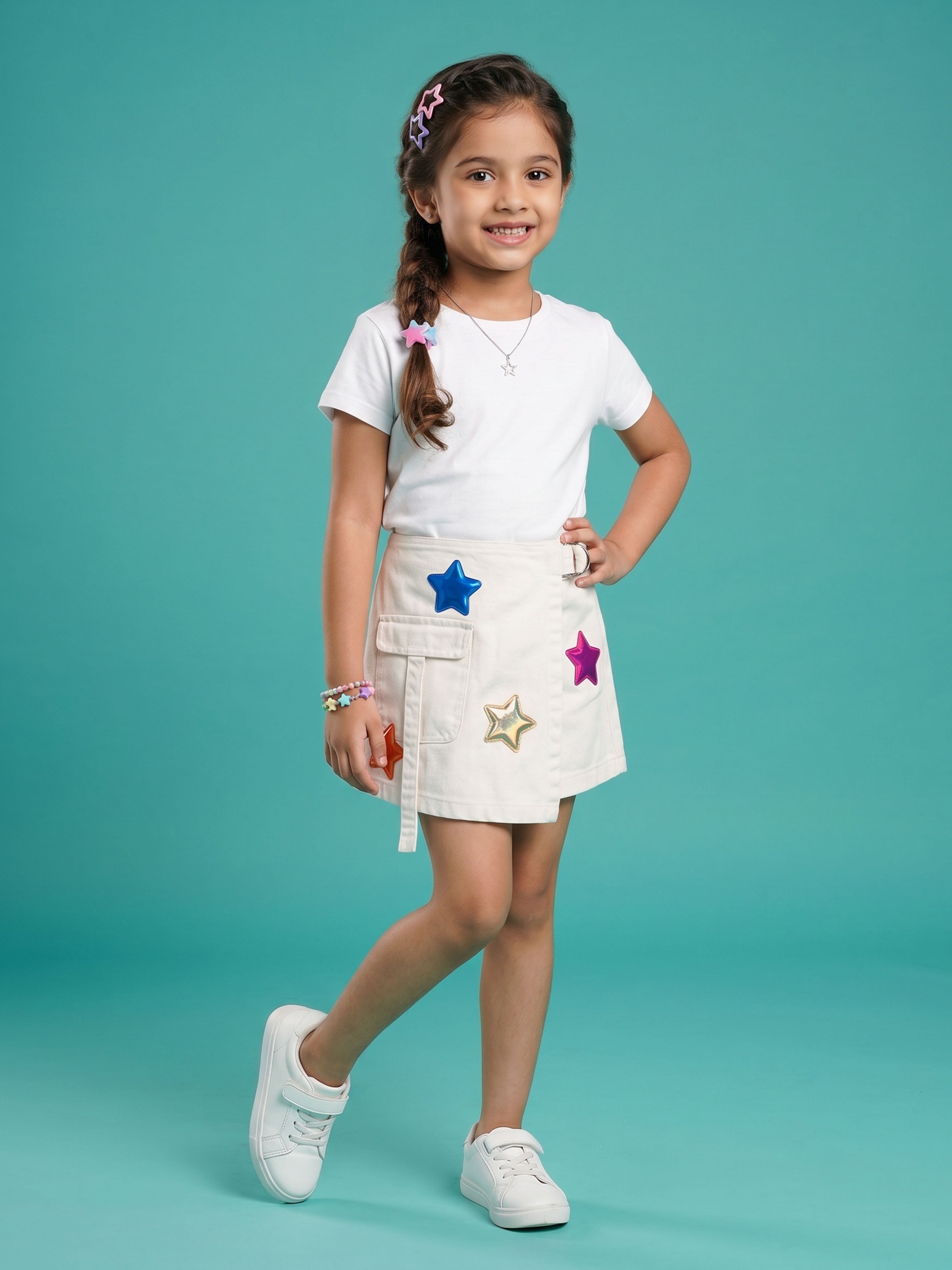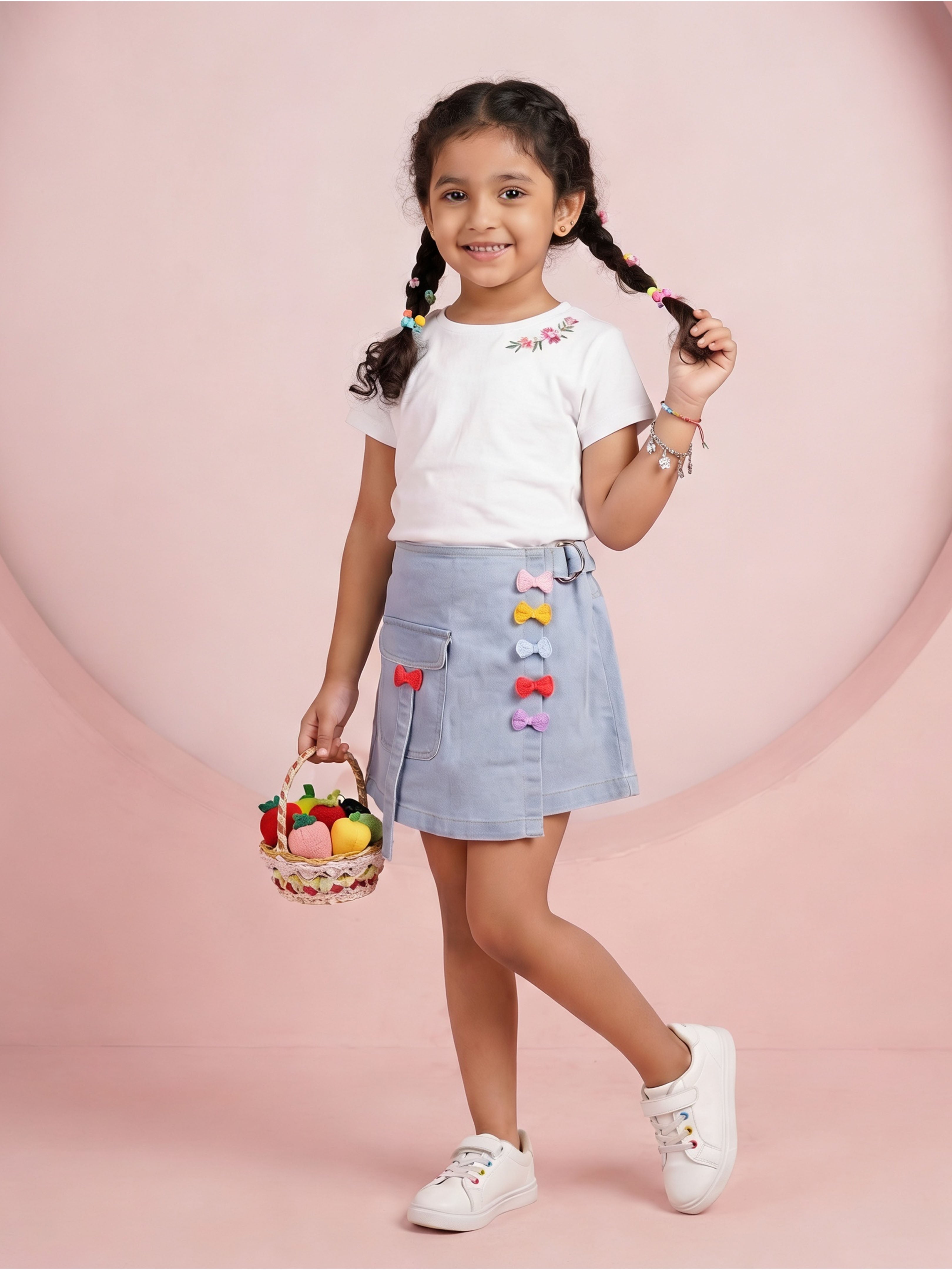 Crafted from durable and comfortable denim fabric, this piece features a structured overlap front panel enhanced with colourful 3D flower appliqué detailing. The appliqué flowers add a soft, cheerful, and eye-catching touch, making this skort perfect for fun outings and special occasions.