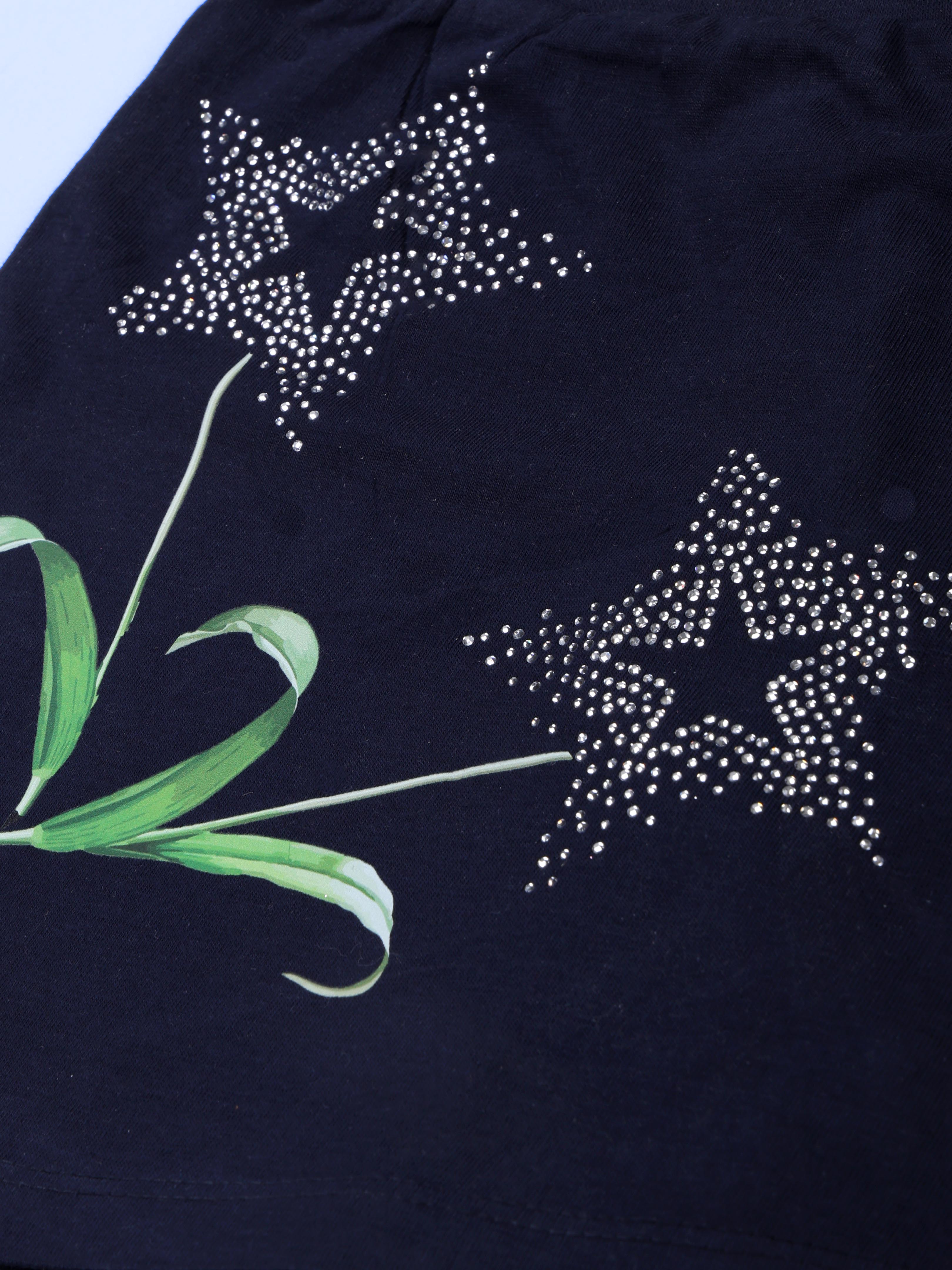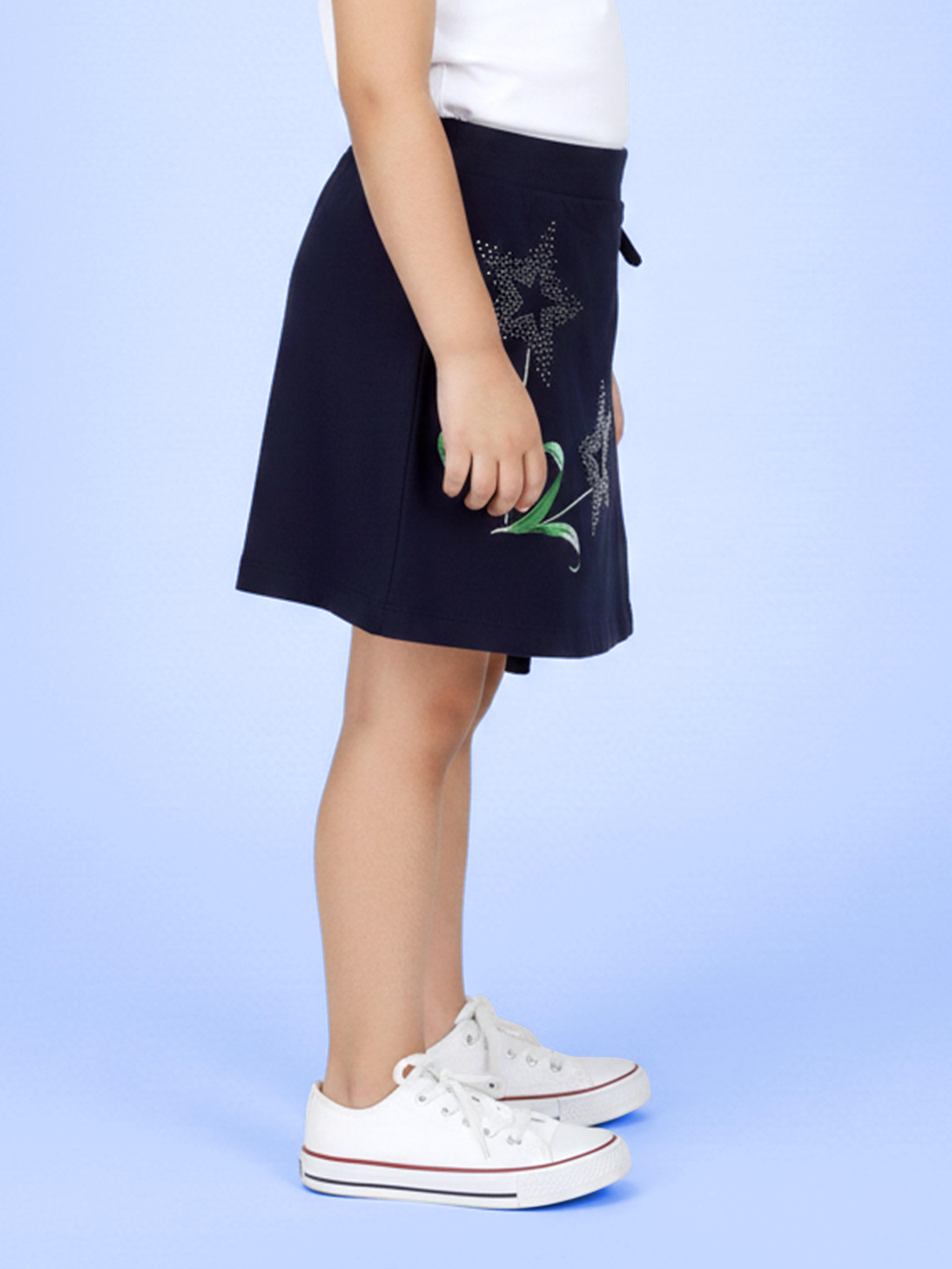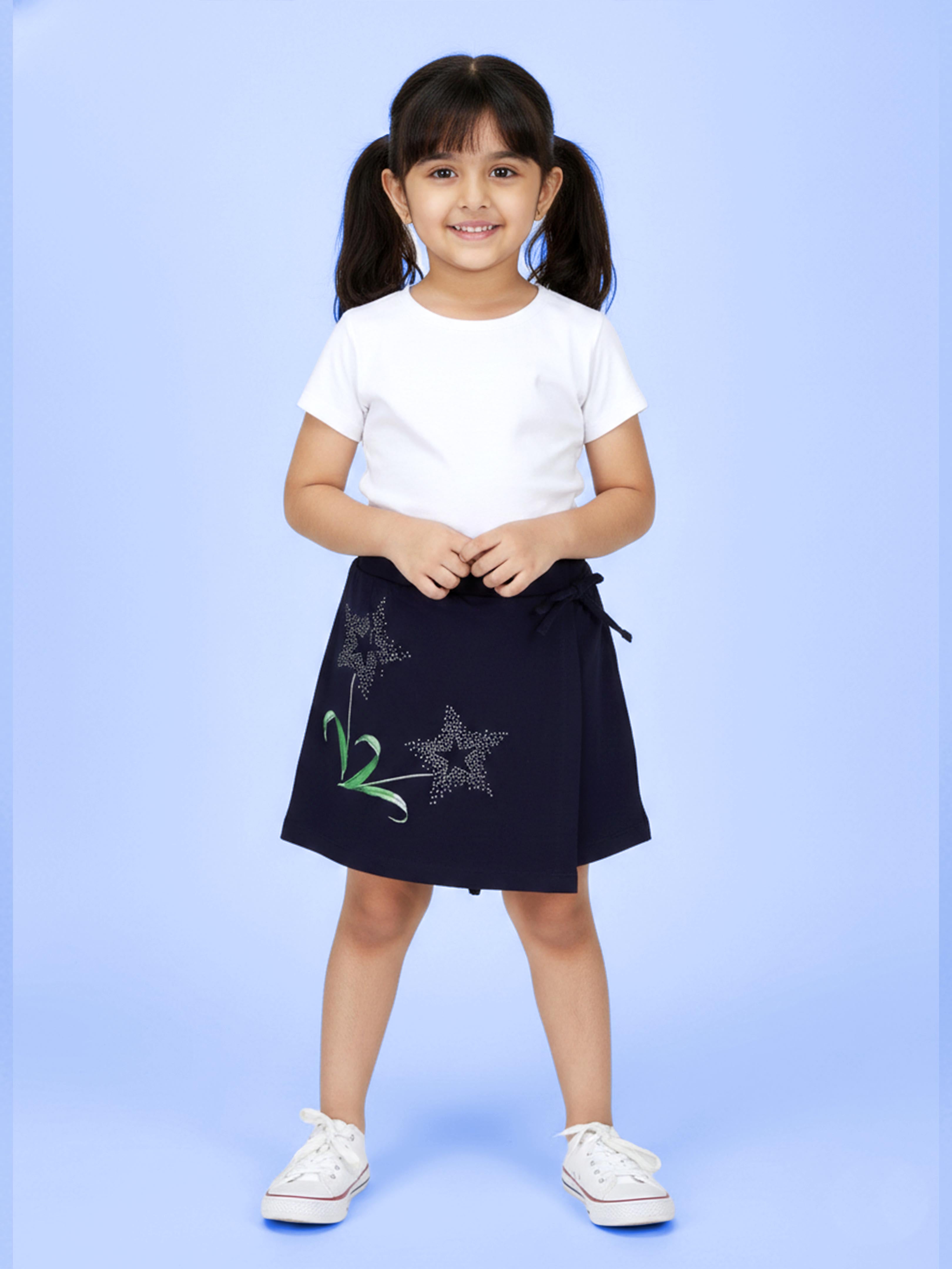 Designed in a rich navy blue shade, this stylish skort features sparkling rhinestone star motifs paired with a delicate leafy accent print, creating a beautiful blend of elegance and playful charm. The wrap-style front panel with a cute side tie-up bow adds a trendy, girly touch, while the built-in inner shorts ensure complete comfort and freedom of movement. Perfect for parties, playdates, casual outings, birthdays, and everyday wear, this skort combines fashion with functionality. Crafted from soft, breathable fabric, it keeps your little one comfortable all day long while making her shine in every step.