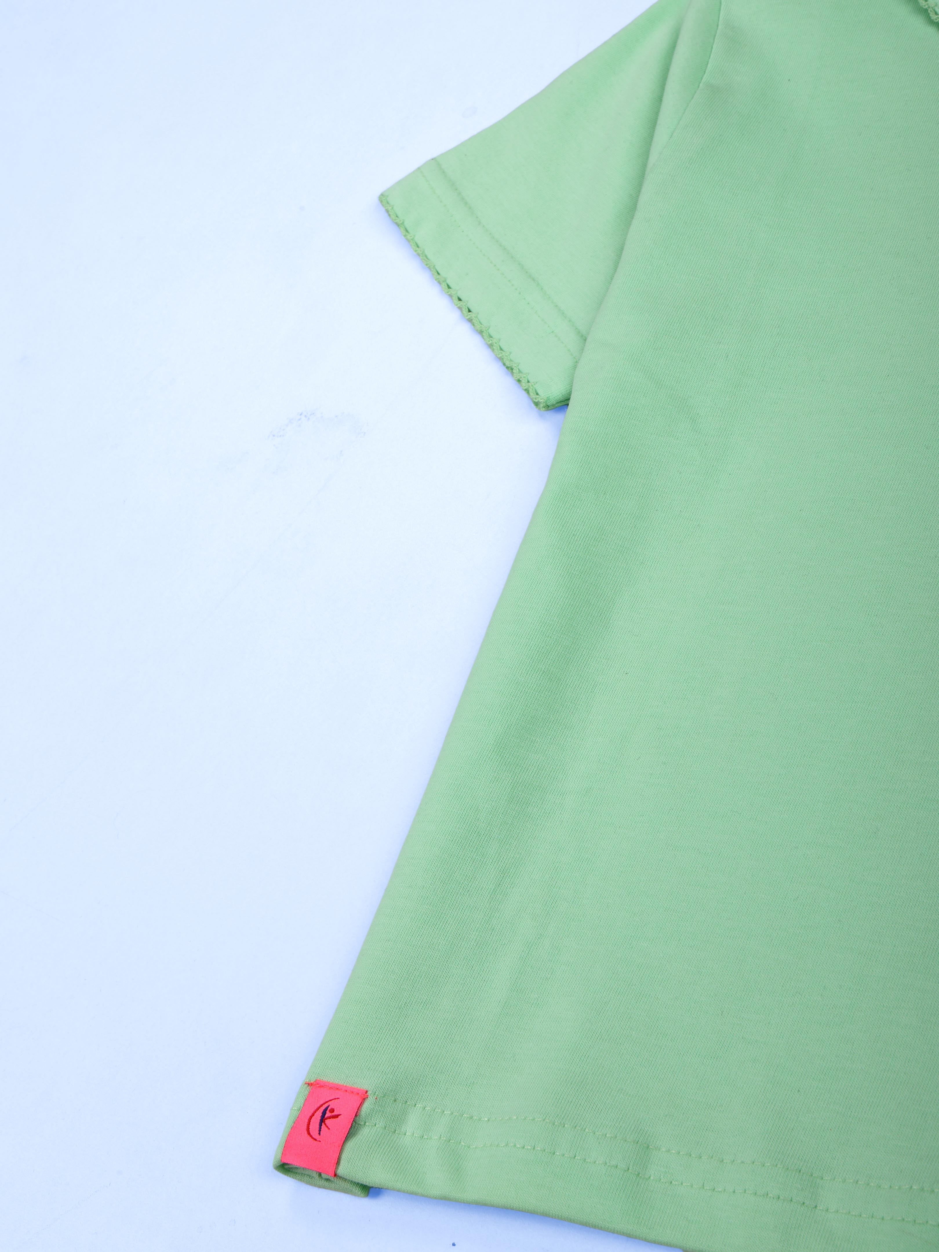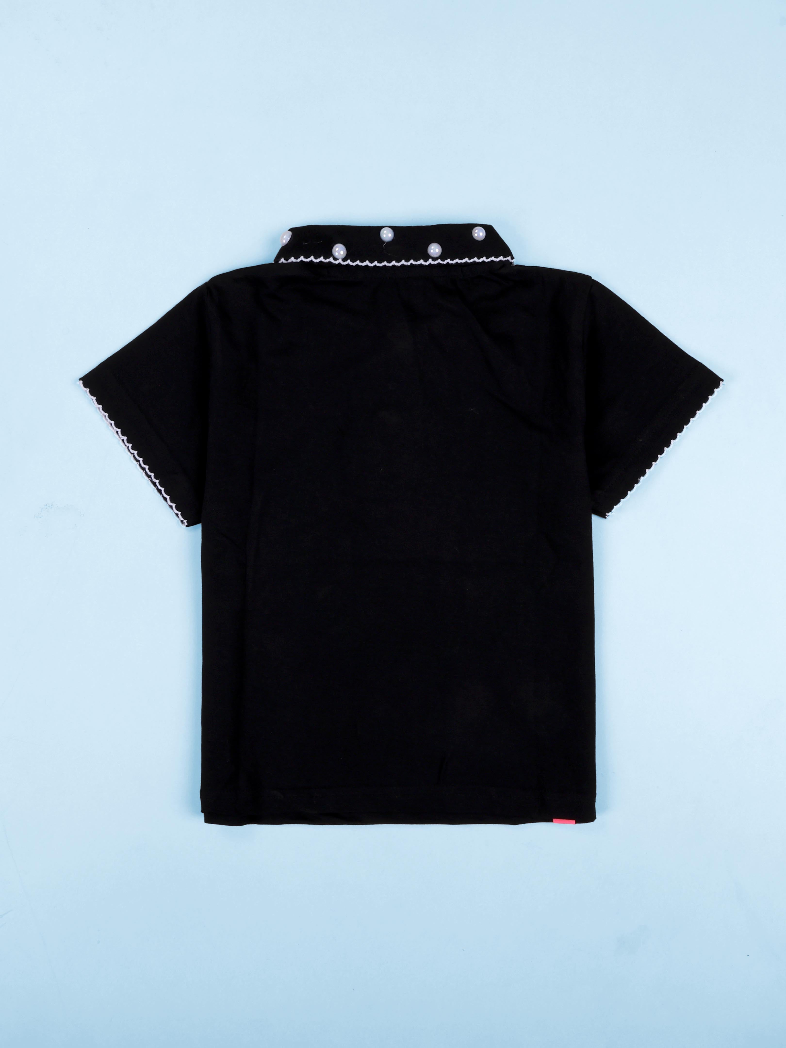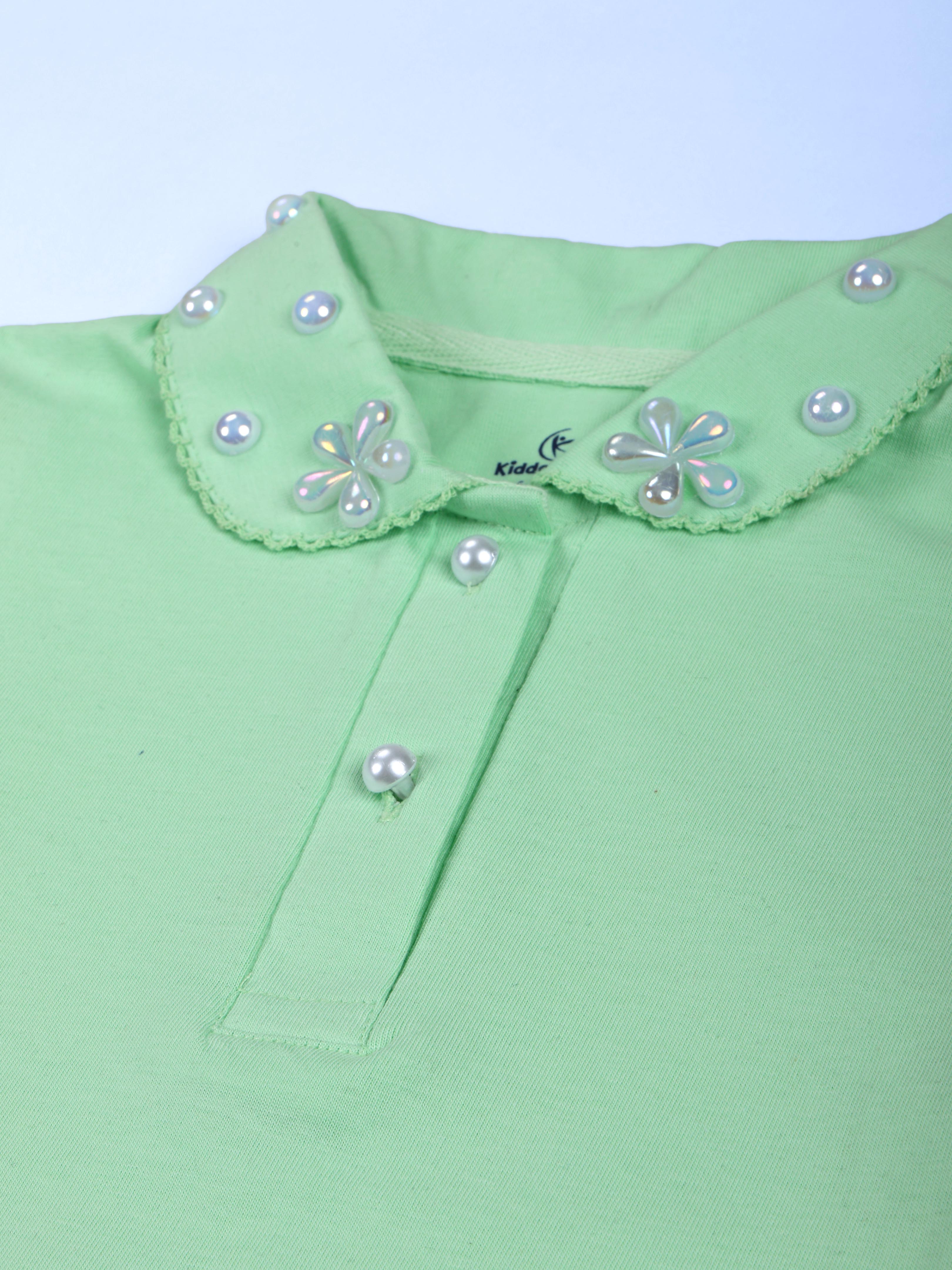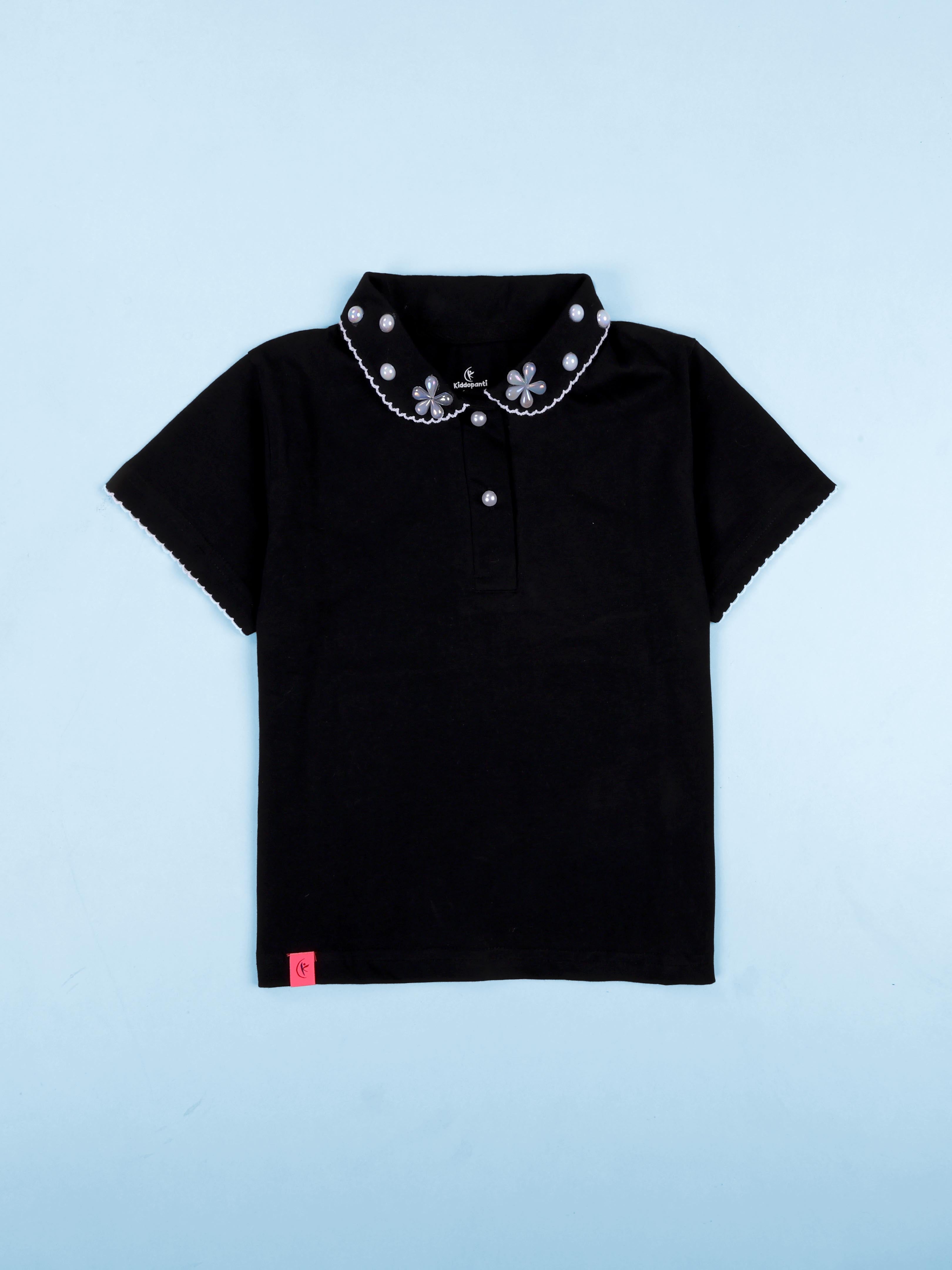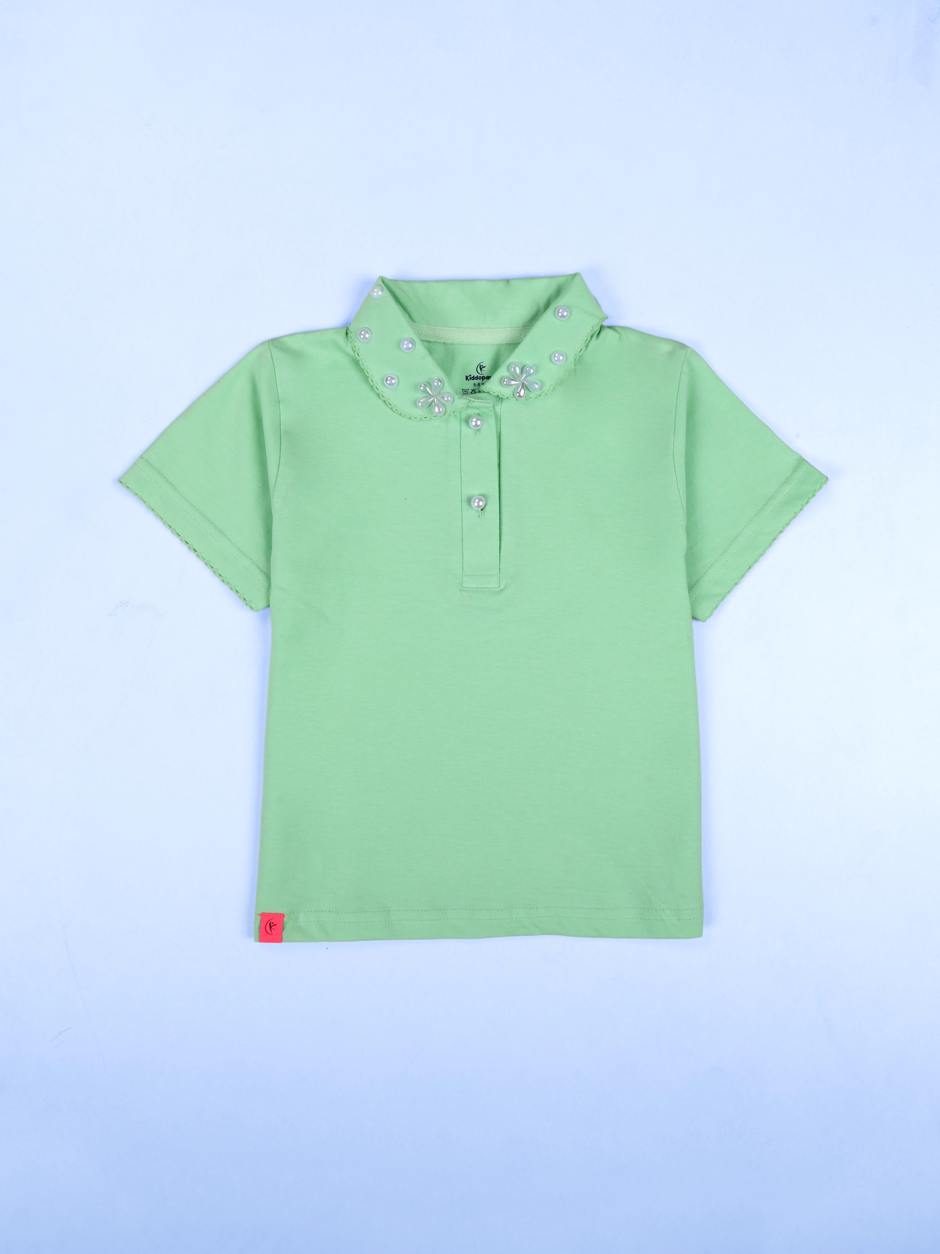 Girls Cotton Solid Crop Length Polo Tee With Picot Trim Collar With Pearls