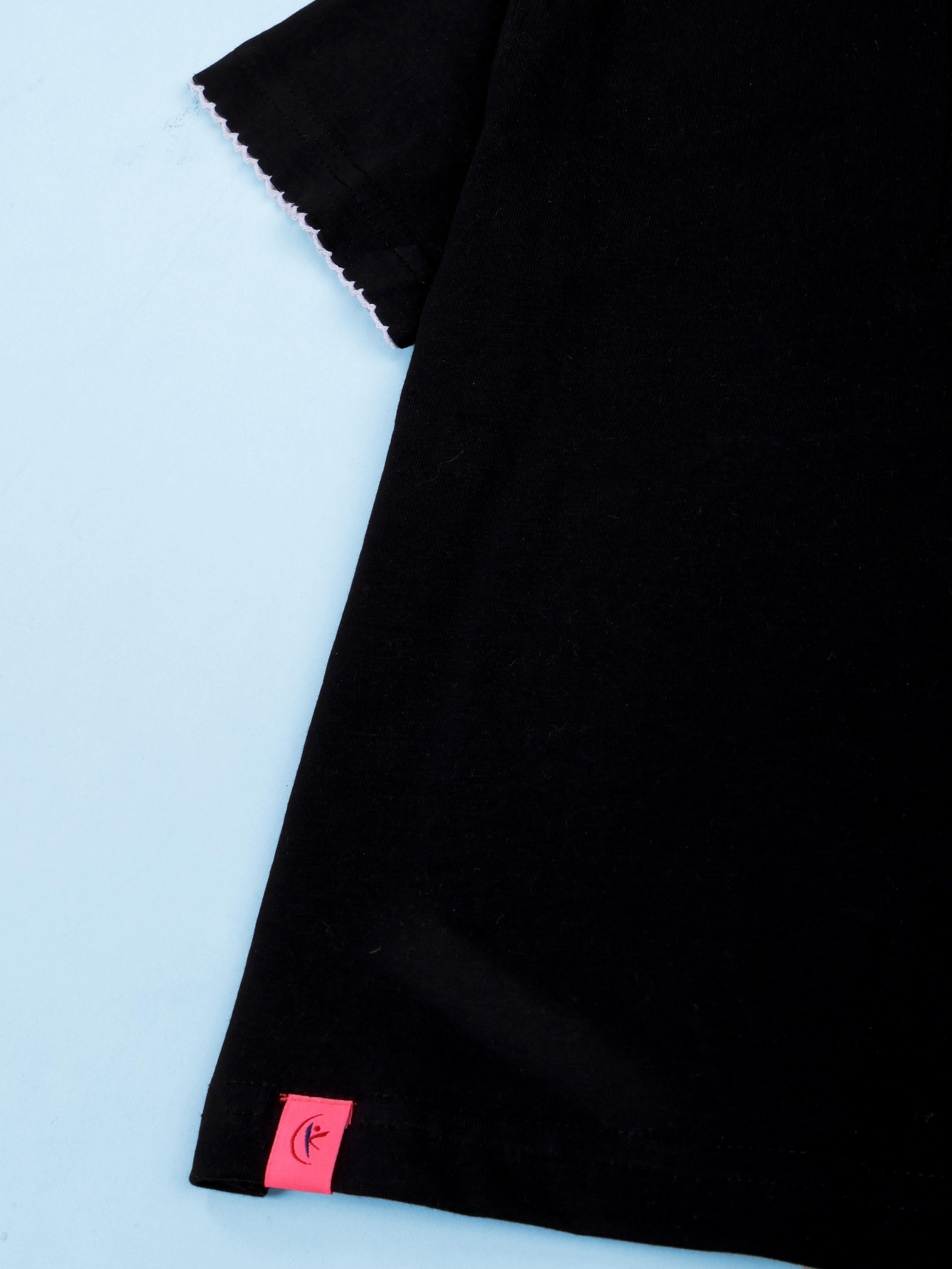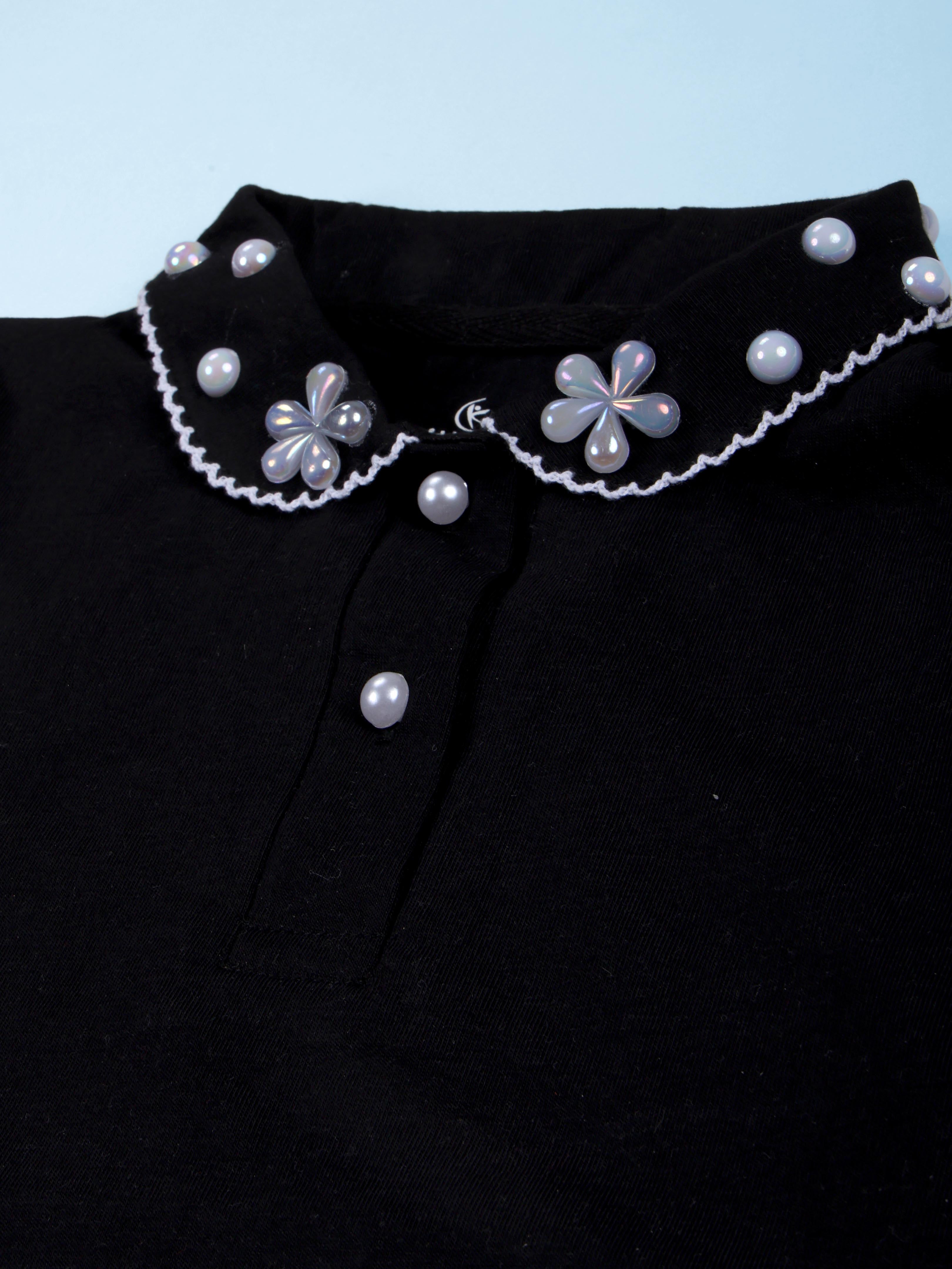 Kiddopanti brings to you the latest fashion clothes for your smart dressing young ones. This Elegant Pearl Embellished T-shirt is a perfect blend of classic charm and modern style for your little fashionista. Designed in a rich solid black colour, this top features a beautifully detailed scalloped collar adorned with pearl accents and floral appliqué, adding a touch of sophistication to everyday wear. The soft, comfortable fabric and relaxed fit make it ideal for both casual outings and special occasions. A stylish essential that lets her shine effortlessly wherever she goes.