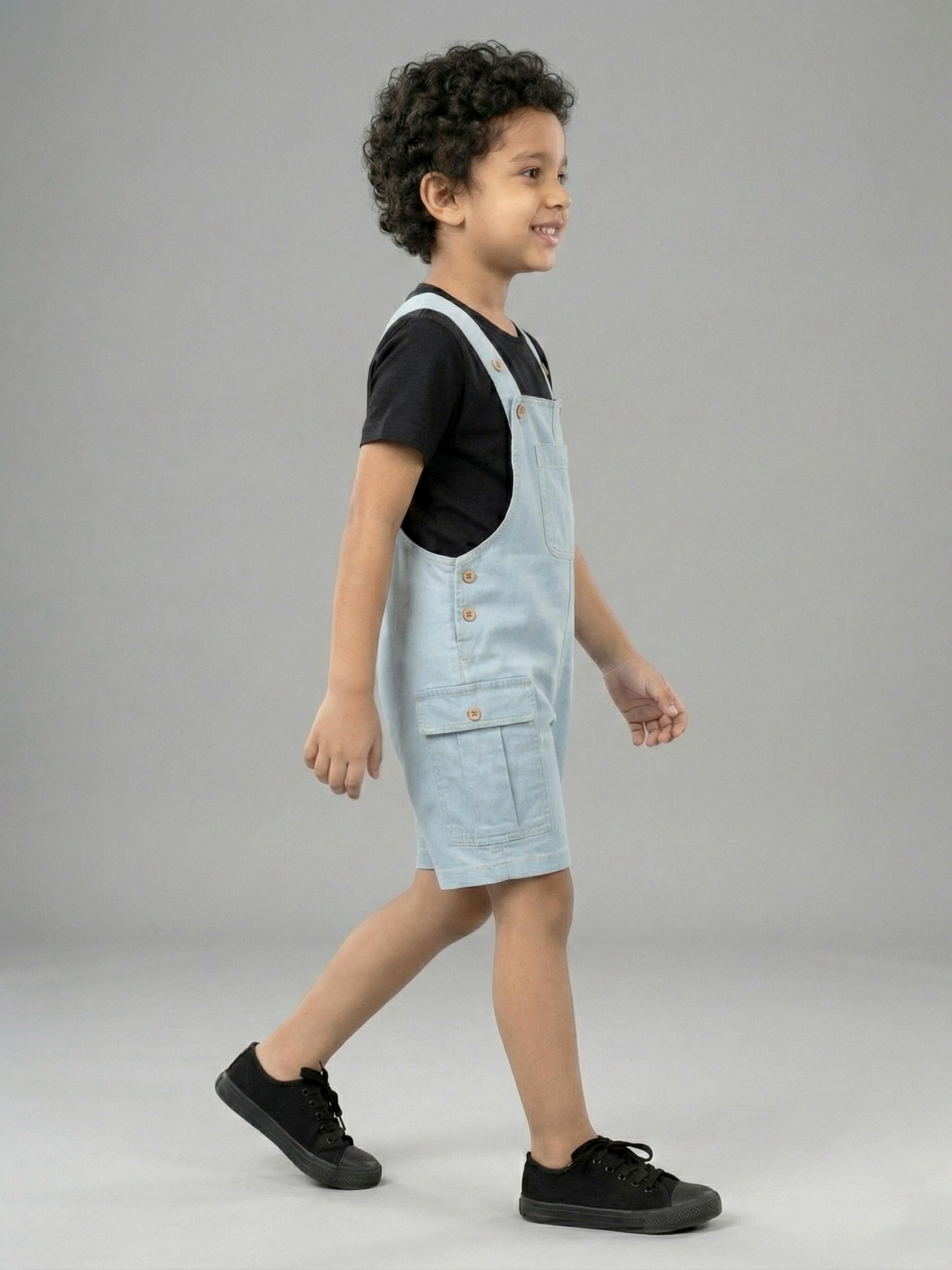 Designed for both style and functionality, these dungaree shorts feature a modern utility-inspired silhouette with practical detailing and a comfortable fit. Crafted for active kids, the design includes wide adjustable shoulder straps, a classic front bib with patch pocket, and trendy cargo pockets for a cool, street-style look. Perfect for everyday wear, outings, travel, or playtime, these dungaree shorts combine durability, comfort, and contemporary fashion in one versatile outfit. The sturdy construction, visible topstitching, and functional button closures make this a stylish yet practical wardrobe essential for boys and girls alike.